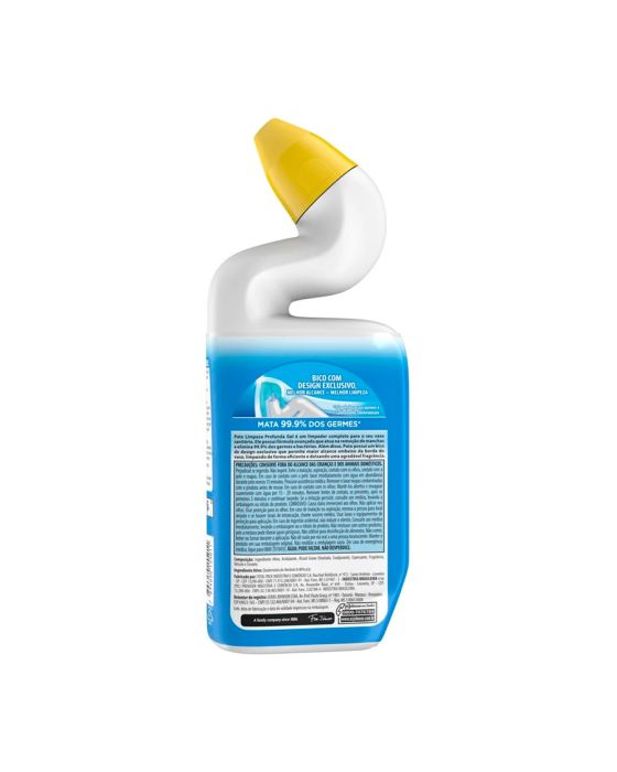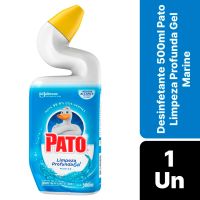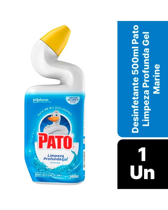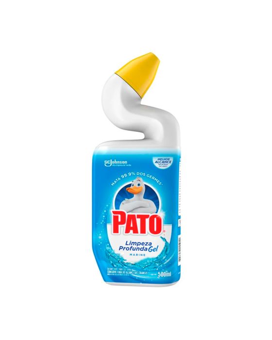 Características:Pato limpeza Profunda Gel é um limpador completo para o seu vaso sanitário. Ele possui fórmula avançada que atua na remoção de manchas e elimina 99,9% dos germes e bactérias. Além disso, Pato possui um bico de design exclusivo que permite maior alcance embaixo da borda do vaso, limpando de forma eficiente e deixando uma agradável fragrância!Detalhes:- Marca: Pato;- Fabricante: SC Johnson;- Modelo: Limpeza Profunda;- Linha: Desinfetantes;- Tipo: Gel;- Fragrância: Marine;- Volume/Peso: 500g / 500ml;- Contém: 1 unidade do produto;- Mata 99,9% dos germes*;- Bico com design exclusivo, melhor alcance = melhor limpeza;- Melhor alcance na borda do vaso;- Água pode faltar, não desperdice.Indústria Brasileira. | Validade: 24 meses após a data de fabricação.Modo de uso:- Levante o assento do vaso sanitário;- Para remover a tampa, aperte as duas superfícies laterais texturizadas e desenrosque completamente;- Direcione o produto sob a borda e aperte uniformemente ao redor do vaso;- Esfregue em cima e embaixo da linha d’água. Deixe-o agir por pelo menos 10 minutos e dê descarga;- Para melhores resultados, reaplique o produto, deixando agir por mais 60 minutos, antes de dar descarga novamente;- Recoloque a tampa e feche, apertando-a até ouvir o clique.Recomendações :- Manter o produto em sua embalagem original;- Não reutilize a embalagem original;- Não reutilize a embalagem vazia;- Não misture com produtos que contém alvejante ou outros produtos químicos caseiros, porque a mistura pode liberar gases tóxicos.Composição:- Quaternário de Amônio 0,46% p/p, Acidulante, Álcool Graxo Etoxilado, Coadjuvante, Espessante, Fragrância, Veículo e Corante.Medidas:- Dimensões do produto: 9 x 4,5 x 23,4cm (CxLxA);- Peso: 529g.* Staphylococcus aureus e Salmonella choleraesuis.ATENÇÃO! CONSERVE FORA DO ALCANCE DAS CRIANÇAS E DOS ANIMAIS DOMÉSTICOS.* As especificações podem ser alteradas sem aviso prévio ** Imagem meramente ilustrativa.