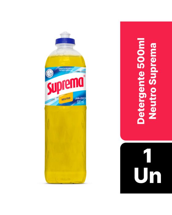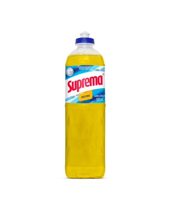 Características:- Limpeza eficiente e cuidado diário: O Detergente Neutro Suprema 500ml foi desenvolvido para proporcionar uma experiência de higienização superior, aliando remoção eficaz de gorduras com suavidade para as mãos. Dermatologicamente testado e aprovado, garante segurança no uso frequente, sem agredir a pele, mesmo em tarefas prolongadas de limpeza.- Fórmula exclusiva e sustentável: Sua fórmula contém ácido linear alquil benzil sulfônico biodegradável e tensoativos aniônicos de alta performance, aliados a neutralizantes, coadjuvantes, conservante, fragrância e água. Esse conjunto garante ação desengordurante potente, ao mesmo tempo que preserva o meio ambiente. A linha Suprema valoriza a sustentabilidade, proporcionando uma opção de limpeza eficiente e responsável.- Versatilidade no uso: Além de ser ideal para a lavagem manual de louças, talheres e utensílios, o detergente pode ser utilizado também na higienização de pisos, vidros, portas e paredes. Pode ser aplicado puro diretamente em esponjas de nylon ou lã de aço, ou diluído em água, garantindo economia e praticidade conforme a necessidade.- Economia e eficiência no dia a dia: Com embalagem de 500ml, o produto oferece rendimento prolongado e ótimo custo-benefício. Sua ação concentrada reduz a necessidade de reaplicações, tornando a limpeza mais rápida e eficaz, sem desperdício.- Tradição e confiança Suprema: A marca Suprema é reconhecida no mercado de higiene e limpeza por investir em tecnologia, pesquisa e sustentabilidade, entregando produtos que unem eficiência e cuidado com o consumidor e o meio ambiente. O detergente neutro é a escolha ideal para quem busca praticidade, economia e respeito à natureza.- Dimensões da embalagem:Comprimento: 6,2cm;Largura: 6,2cm;Altura: 22,5cm;Peso: 526g.ATENÇÃO! CONSERVE FORA DO ALCANCE DAS CRIANÇAS E DOS ANIMAIS DOMÉSTICOS.* As especificações podem ser alteradas sem aviso prévio ** Imagem meramente ilustrativa.