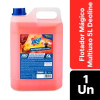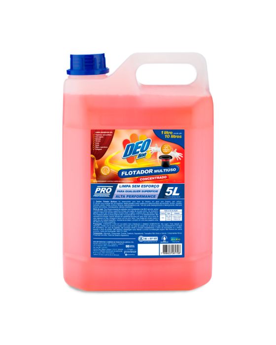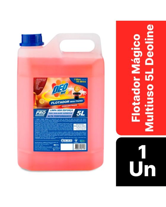 Características:- Limpador Flotador Mágico Multiuso 5L Deoline, desempenho profissional para limpeza pesada e geral: O Flotador Mágico Multiuso Deoline foi desenvolvido para oferecer alta performance em limpezas domésticas e profissionais. Sua fórmula concentrada utiliza tecnologia de flotação, permitindo que a sujeira se desprenda com facilidade de superfícies como pisos, paredes, revestimentos, equipamentos, eletrodomésticos, fórmicas e áreas encardidas, garantindo resultados rápidos e eficientes com menor esforço.- Ação potente com fórmula biodegradável e aplicação versátil: Enriquecido com tensoativos biodegradáveis, o produto remove resíduos difíceis como graxa, óleo, ferrugem, cera, cola, batom e fuligem. Seu desempenho superior facilita a remoção até mesmo de sujidades impregnadas, mantendo segurança para o usuário e menor impacto ambiental.- Facilidade de uso com rendimento elevado: Pode ser usado puro para limpeza pesada ou diluído em proporções de 1:5 até 110 para limpezas gerais e leves, alcançando ótimo rendimento, cada litro rende até 10 litros. Não requer enxágue na maioria das superfícies, o que agiliza o processo de higienização. Para pisos, recomenda-se esfregar e enxaguar para acabamento perfeito.- Características físico-químicas e composição técnica: Com pH alcalino de 10,0 a 11,0, o produto atua de forma eficiente sobre sujeiras gordurosas e incrustadas. Possui aspecto líquido translúcido alaranjado, odor característico e densidade entre 0,99 e 1,1 g/ml. Sua formulação inclui poliacrilato de sódio, óxido de dimetil e alquilamina, tensoativo não iônico, sequestrante, adjuvantes, corante, essência e veículo, garantindo alto desempenho e estabilidade.- Aplicações e áreas de uso: Indicado para residências, comércios, indústrias, escolas, clínicas e qualquer ambiente que exija limpeza confiável e eficiente. Ideal para manutenção diária ou higienização profunda, sendo seguro para a maioria das superfícies após teste prévio.- Sobre a marca Deoline: A Deoline é reconhecida por oferecer soluções de limpeza de alto padrão para o mercado profissional e doméstico, combinando tecnologia, segurança e excelente rendimento. - Dimensões do produto:Comprimento: 19cm; Largura: 13,5cm; Altura: 29cm;Peso: 5,395kg.IMPORTANTE! CONSERVAR FORA DO ALCANCE DAS CRIANÇAS E DOS ANIMAIS DOMÉSTICOS.* As especificações podem ser alteradas sem aviso prévio ** Imagem meramente ilustrativa.