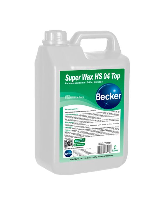 CaracterísticasÉ um impermeabilizante à base de polímeros acrílicos e ceras sintéticas de alta qualidade que permite ao filme grande resistência ao tráfego, brilho molhado tipo wet look e sistema de manutenção com polimento ultra high speed. Acabamento de última geração, indicado para todos os tipos de piso. Tem grande poder de cobertura e proteção para os pisos e ao ser aplicada deixa uma película lisa, dura e brilhante. Podendo ser polida por polidoras de 1500 a 3000 RPM.- Conteúdo: 5L- Fragrância: NeutroEspecificações- Físicas - Aspecto: Líquido - Cor: Branco - pH: 8,0 - 10,0 - Sólidos: 19 - 23%- Químicas - Composição: Copolímero acrílico, etil éter dietilenoglicol, agente formador de filme, emulsificante, coadjuvante, plastificante, conservante e veículo.Campo de aplicação: Formulado para todos os tipos de pisos laváveis em indústrias, escolas, clubes, hospitais, hotéis, cinemas supermercados, etc.Finalidade: Protege os pisos, deixando uma camada dura e resistente sobre os mesmos. Sua moderna formulação proporciona um efeito antiderrapante com eliminação por completo da porosidade do piso. Propicia um brilho molhado tipo WET LOOK.Modos de uso: Antes de aplicar SUPER WAX HS 04, o piso deverá estar limpo, seco e desincrustado. Para este fim, deve-se usar REMOVIT WAX. Aplica-se SUPER WAX HS 04 puro com mop ou pano de chão, tomando-se o cuidado de torcê-los para evitar excesso de produto.Para consultar a FDS (Ficha com Dados de Segurança), acesse (copiar e colar no navegador):https://preview--consultafdscontabilista.base44.app/share?product_id=74729* As especificações podem ser alteradas sem aviso prévio** Imagem meramente ilustrativa
