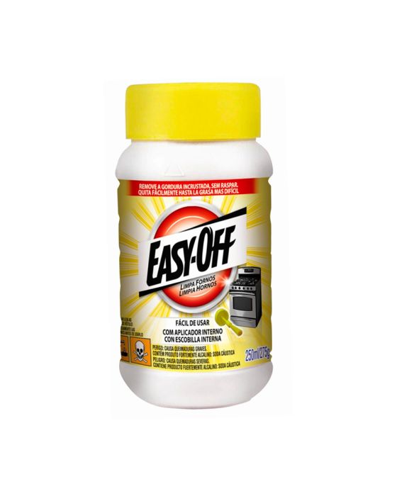 Caracteristicas:EASY-OFF remove a gordura incrustada, sem raspar, deixando os fornos, grelhas e queimadores de gás limpos e brilhando.Detalhes:- Marca: EASY-OFF / Reckitt.- Modelo: Limpa fornos.- Peso: 275g.- Quantidade: 250ml.- Com aplicador interno.Modo de usar:- FORNO: Forrar o chão sob a porta do forno com jornal.- Utilize o pincel e espalhe o produto nas superfícies internas do forno.- Aplicar cuidadosamente para não respingar, iniciando pela traseira, pincelando de cima para baixo, depois nas paredes laterais, base, superior e porta, sucessivamente, pincelando sempre para o fundo do forno.- Deixar o forno fechado por 30 minutos.- Para remover o produto basta lavar com uma solução de água com um pouco de vinagre.- Caso necessário, refaça o pocedimento.- QUEIMADORES DE GÁS E GRELHAS: Poceder da mesma forma.* Não aplique em superfície aquecida, alumínio, superfícies cromadas como moldura da porta do forno e nem em pinturas como em exteriores de fogão, refrigeradores, e ármarios de cozinha. Não usar em forno microondas e fornos elétricos.** Evite contato do produto com fios e ligações elétricas.Ingredientes:- Soda cáustica, espessante e água.Perigo! Pode causar queimaduras severas à pele e dano aos olhos (provoca lesões oculares graves).CONSERVE FORA DO ALCANCE DAS CRIANÇAS E DOS ANIMAIS DOMÉSTICOS.* As especificações podem ser alteradas sem aviso prévio ** Imagem meramente ilustrativa.