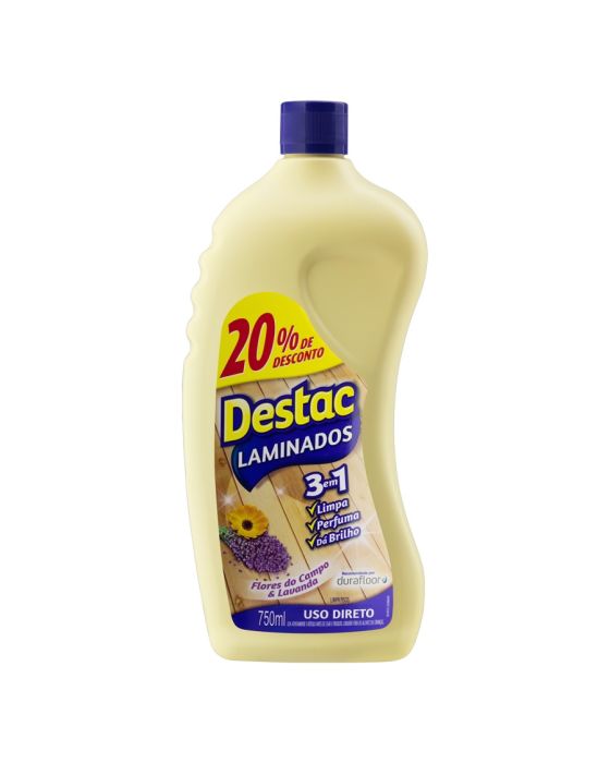 Cheirinho de limpeza é uma delícia, não é mesmo? Mas manter a casa sempre limpa e higienizada pode não ser uma tarefa fácil. Por isso, é importante contar com a ajuda de produtos de qualidade na hora da faxina. Assim, fica mais fácil manter tudo brilhando!Pensando nisso, a Destac uniu tudo o que você precisa – limpeza, brilho e uma deliciosa fragrância – em um único produto de limpeza que não pode faltar na sua dispensa: conheça o Limpa Pisos com Brilho Pisos Laminados Lavanda & Alfazema!Feito a partir das melhores matérias-primas, esse Limpa Pisos Destac proporciona limpeza e um brilho natural a pisos laminados, além de deixar um suave perfume de longa duração. Prático, esse produto não precisa ser diluído. Mas, atenção: seu uso é destinado apenas para pisos laminados!Caracteristicas:Composição: - Lauril sulfato de sódio, surfactante não iônico, solvente, coadjuvantes, fragrância e água.Informação Adicional: - Limpa e dá brilho. - Uso direto, fácil assim! - Seca mais rápido que a versão anterior. - Perfume de longa duração: LAVANDA & ALFAZEMA. - Testado e aprovado pela marca de pisos laminados DURA FLOOR® * As especificações podem ser alteradas sem aviso prévio ** Imagem meramente ilustrativa.