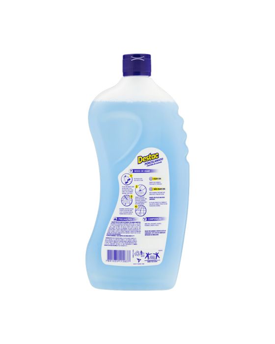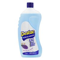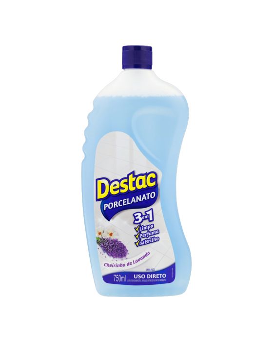 Caracteristicas:O Destac Limpa Porcelanato, limpa e resgata o brilho natural dos pisos de porcelanato, deixando um agradável perfume de lavanda de longa duração. Não há a necessidade de ser diluído em água, sendo fácil e prático de usarDetalhes: - Marca: Destac / Reckitt.- Modelo: Limpa porcelanatos.- Quantidade: 750ml.- Fragrância: Cheirinho de lavanda.- Uso direto. Ingredientes:- Amina óxida, coadjuvante, solventes, fragrância, corantes e veículo.Modo de usar:- Agite antes de usar.- Aplique diretamente sobre um pano limpo e seco. Em seguida passe o pano sobre o piso de maneira uniforme e deixe secar.- Durante a aplicação não use em excesso, para evitar que a superfície fique escorregadia. Não é necessário enxaguar.- Em grandes superfícies aplique o produto em um pano úmido, e em seguida passe em pequenas áreas de cada vez.Recomendações: - Usar em: Somente em pisos cerâmicos, porcelanatos e vitrificados.- Não usar em: Pisos de madeira, porcelanato não esmaltado de tonalidade escura.* As especificações podem ser alteradas sem aviso prévio ** Imagem meramente ilustrativa.