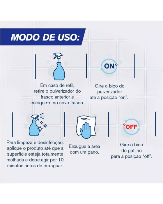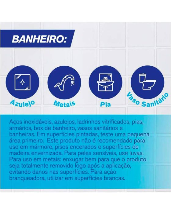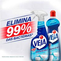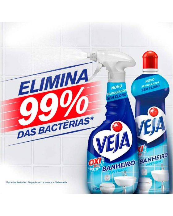 Características:O Veja® Banheiro Oxi Ativo é o produto ideal para branquear as suas superfícies, e realizar a limpeza efetiva do seu banheiro. Aplique, enxágue e veja os resultados. É mais praticidade e rapidez para você ter mais tempo de aproveitar o seu dia. Além disso, elimina 99,9% das bactérias e vírus.Detalhes:- Marca: Veja;- Modelo: Banheiro Antibac;- Linha: Limpadores;- Fragrância: Original;- Volume: 500ml;- Contém: 1 unidade do produto com 500ml;- Desinfeta e Branqueia;- Elimina 99,9% das bactérias e o vírus da COVID-19;- Sem agressão do cloro;- Remove as Sujeiras do Banheiro;- Multissuperfícies inclusive metais;- Ação Branqueadora;- Fragrância agradável;- Embalagem promocional;Superfícies Recomendadas: - Aços inoxidáveis, azulejos, ladrilhos vitrificados, pias, armários, box de banheiro, vasos sanitários e banheiras.Modo de uso:- Para limpeza e desinfecção: Aplique o produto até que a superfície esteja totalmente molhada e deixe agir por 10 minutos antes de enxaguar. Enxágue a área com um pano e remova completamente o produto da superfície.Composição: - Ingrediente Ativo, Alquilbenzeno Sulfonato de Sódio, Lauril Éter Sulfonato de Sódio, Acidificante, Sequestrante, Fragrância, Branqueador Óptico, Coadjuvantes, Solvente e Água.ATENÇÃO! CONSERVE FORA DO ALCANCE DAS CRIANÇAS E DOS ANIMAIS DOMÉSTICOS.* As especificações podem ser alteradas sem aviso prévio ** Imagem meramente ilustrativa.
