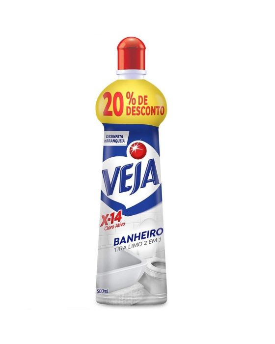Caracteristicas: Veja Banheiro X-14 2 em 1 Tira Limo Cloro Ativo com espuma limpa e remove as sujeiras mais difícies diante dos seus olhos.- Superfícies: Box, Pisos e azulejos, vaso sanitário, pias de banheiro, banheiras.- Sujeiras: Gordura do Banheiro, Limo, Marcas de Dedos.- Beneficios: Ação Desinfetante, Limpeza Profunda- Apresentação: Squeeze- Conteúdo: 500 ML * As especificações podem ser alteradas sem aviso prévio ** Imagem meramente ilustrativa