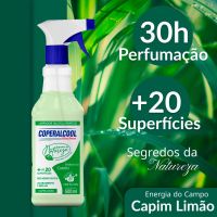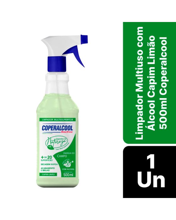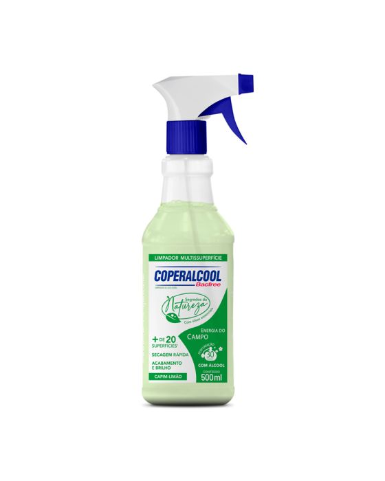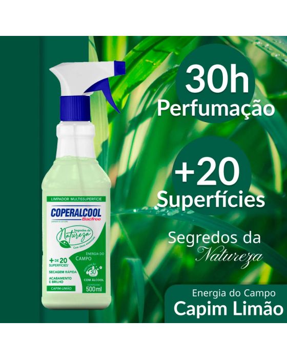 Características:O equilíbrio perfeito entre limpeza e bem-estar. O Limpador Multissuperfície Segredos da Natureza é o primeiro produto à base de álcool no mercado que foi desenvolvido para ser aplicado em + de 20 superfícies!A fragrância de Capim-limão estimula a criatividade, alegria e a liberdade, aliviando o estresse e a ansiedade.Detalhes:- Marca: Coperalcool;- Modelo: Backfree Segredos da Natureza Energia do Campo;- Linha: Limpadores;- Tipo: Spray;- Fragrância: Capim Limão;- Volume: 500ml;- Cor: Verde;- Contém: 1 unidade do produto;- 5 em 1: Limpa, Perfuma, Dá Brilho, Desengordura e Tira Limo;- Mais de 20 superfícies podem ser limpas;- Até 30 horas de perfumação;- Com álcool;- Com óleos essenciais;- Secagem rápida;- Acabamento e brilho.Indústria Brasileira. | Validade: 24 meses após a data de fabricação impressa na embalagem.Ideal para:- Ideal para usar em Azulejo, Alumínio, Cerâmica, Porcelanato, Vidro, Laminado Vinílico, Madeira, Mármore, Fórmica, Tecido, Metal, Plástico, Fogão, Geladeira, Micro-ondas, Forno Elétrico, Eletrodomésticos, Superfícies enceradas e laqueadas e espelhos.Modo de usar:- Para limpeza mais profunda: Aplique o produto puro na superfície a ser limpa e esfregue com um pano ou esponja, deixe agir por cerca de um minuto e remova a sujeira com um pano úmido ou enxágue, se necessário.- Para limpeza mais superficial ou de pisos e azulejos: Aplique o produto sobre a superfície a ser limpa e espalhe com um pano ou flanela, removendo a sujeira, em seguida para finalização e brilho, passe um pano seco , aplique novamente o produto e espalhe com um pano ou flanela.Recomendações:- Teste em uma pequena área não visível antes de usa-lo pela primeira vez;- Para limpeza de superfícies grandes, aplique por partes e realize o enxágue sempre que necessário.Conservação:- Conservar em local em local seguro, coberto, ventilado e ao abrigo do sol e do calor;- Não derramar sobre o fogo, manter afastado do fogo.Composição:- Água, Álcool Etílico, Tensoativo Aniônico, Tensoativo Catiônico, Emulsificante, Sequestrante, Conservante e Fragrância.Medidas:- Dimensões do produto: 7 x 9,5 x 24cm (CxLxA);- Peso: 500g.ATENÇÃO! MANTENHA FORA DO ALCANCE DAS CRIANÇAS E DOS ANIMAIS DOMÉSTICOS.* As especificações podem ser alteradas sem aviso prévio ** Imagem meramente ilustrativa.