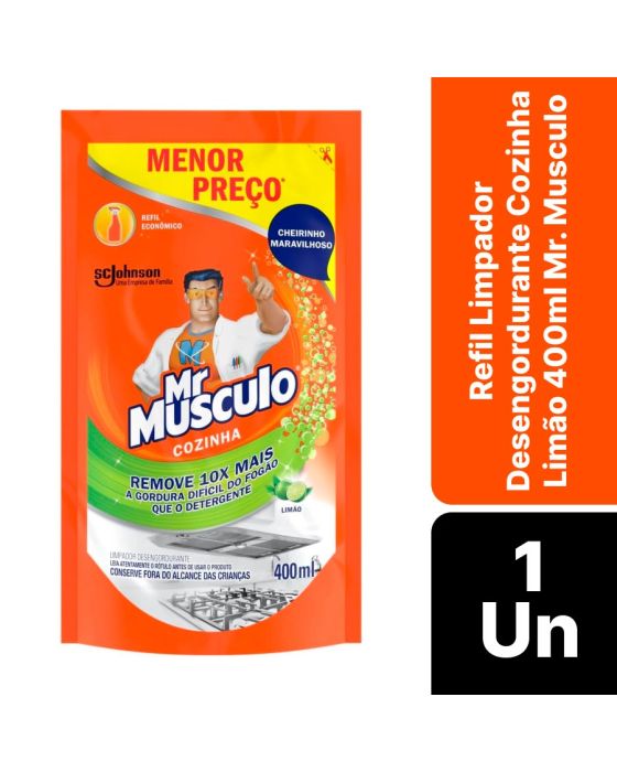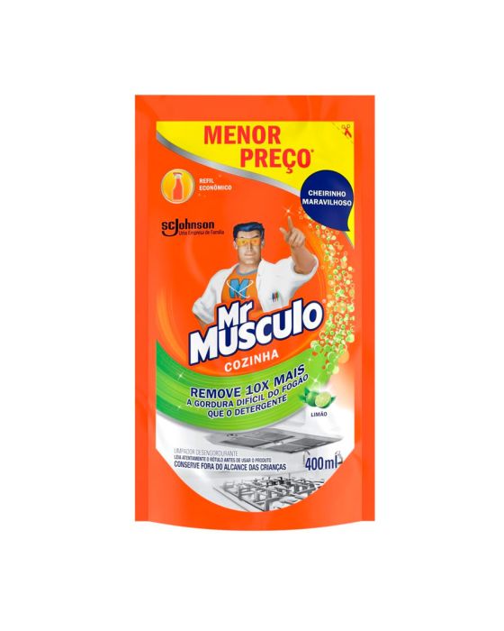 Características:O Mr. Músculo Cozinha é um desengordurante que age profundamente e proporciona uma limpeza poderosa, removendo 100% de gordura das superficies. Ao contrário do detergente ou sabão para louças, você pode aplicar o produto diretamente e limpar com um pano, sem necessidade de enxágue. Pode ser usado na limpeza diaria, é muito mais pratico!Detalhes:- Marca: Mr. Músculo;- Linha: Desengordurante;- Tipo: Refil;- Fragrância: Limão;- Volume/Peso: 400ml;- Contém: 1 unidade do produto com 400ml;- Remove 10x mais a gordura difícil do fogão que o detergente;- Embalagem promocional;- Refil Econômico;- Cheirinho maravilhoso;- Água pode faltar, não desperdice.Indústria Brasileira. | Validade: Válido por 24 meses após a data de fabricação impressa na embalagem.Ideal para:- Indicado para limpeza de fogões, coifa, exaustores, bancada, paredes, pias e azulejos cerâmicos e esmaltados.Modo de uso:- Corte a embalagem no local indicado;- Coloque o gargalo do frasco vazio de Mr. Músculo Cozinha junto a abertura do refil;- Vire para transferir o conteúdo do refil para o frasco;- Coloque o aplicador no frasco;- Gire o bocal até a posição ON ficar para cima;- Aplique diretamente nas superfícies;- Enxugue com um pano, não precisa enxaguar;- Para remover as sujeiras mais difíceis, deixe o produto agir por alguns minutos antes de enxugar com um pano.* Pode ser usado diretamente sobre as superfícies ou como refil para seu frasco vazio de Mr. Músculo Cozinha (SKU 73928).Recomendação:- Não recomendado para madeira, alumínio, aço escovado e superfícies envernizadas ou levemente porosas;- Não aplicar em produtos eletrônicos, materiais de plástico e borracha;- Utilizar apenas em pinturas originais de fábrica;- Teste em uma pequena área antes de usar pela primeira vez.Conservação:- Evite contato com olhos, boca e pele, caso tenha contato, lavar imediatamente com água em abundância;- Mantenha em lugar seco, fresco, arejado e ao abrigo da luz solar direta;- Não reutilize a embalagem vazia para outros fins;- Não dê nada por via oral a uma pessoa inconsciente.Composição:- Álcool Tridecílico, Aspiração Etoxilado, Lauril Dimetil, Amina Óxida, Veículo, Alcalinizante, Fragrância, Quelante.Medidas:- Dimensões da embalagem: 12,5 x 5,5 x 23cm (CxLxA);- Peso: 422g.IMPORTANTE! CONSERVAR FORA DO ALCANCE DE CRIANÇAS E ANIMAIS DOMÉSTICOS.* As especificações podem ser alteradas sem aviso prévio ** Imagem meramente ilustrativa.