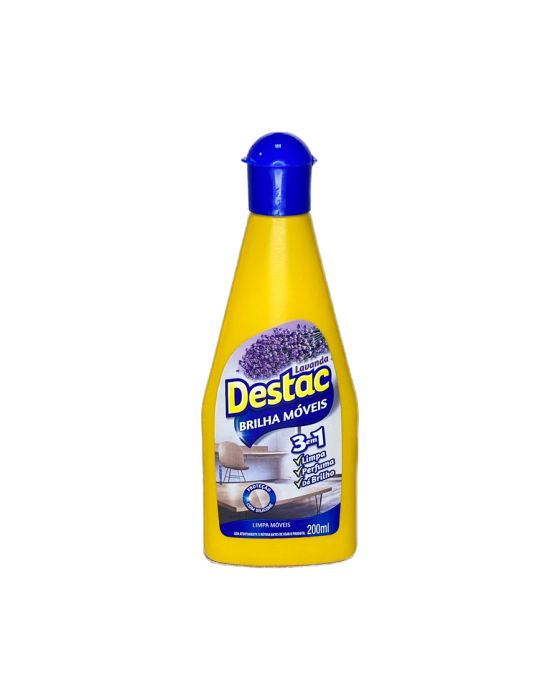 Carateristicas:Com o Brilha Móveis Destac você limpa e deixa seus móveis brilhando com um agradável perfume de longa duração.Sua avançada fórmula com silicone forma uma camada com exclusiva proteção Destac, garantindo mais durabilidade para os seus móveis preferidos.A fómrula do Brilha Móveis Destac possibilita aplicação em azulejos, armários de fórmica, superfícies de mármore, vidros, espelhos, madeira tratada, plásticos, esmaltados e eletrodomésticos.- Fragrância: Lavanda- 200ml- 3 em 1: Limpa, perfuma e dá brilhoInstruções de uso:- Agite antes de usar, não aplicar em excesso- Não é preciso tirar o pó antes de aplicar o produto- Aplique com um pano seco e limpo de maneira uniforme pela área desejada- Lustre com um pano seco ou flanela limpa para realçar o brilho * As especificações podem ser alteradas sem aviso prévio ** Imagem meramente ilustrativa
