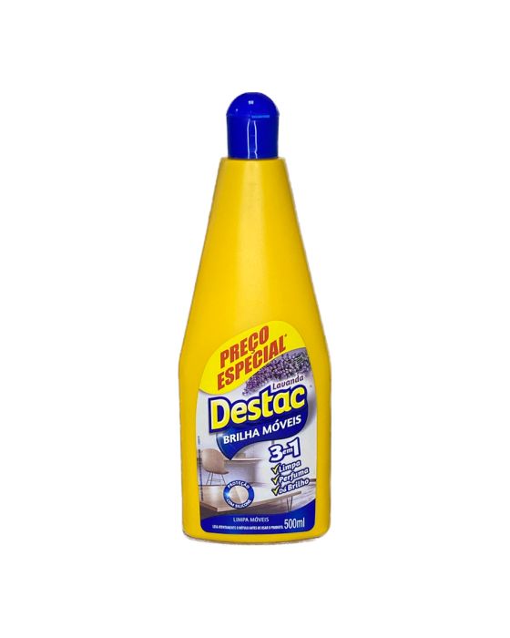Carateristicas:Com o Brilha Móveis Destac você limpa e deixa seus móveis brilhando com um agradável perfume de longa duração.Sua avançada fórmula com silicone forma uma camada com exclusiva proteção Destac, garantindo mais durabilidade para os seus móveis preferidos.A fómrula do Brilha Móveis Destac possibilita aplicação em azulejos, armários de fórmica, superfícies de mármore, vidros, espelhos, madeira tratada, plásticos, esmaltados e eletrodomésticos.- Fragrância: Lavanda- 500ml- 3 em 1: Limpa, perfuma e dá brilhoInstruções de uso:- Agite antes de usar, não aplicar em excesso- Não é preciso tirar o pó antes de aplicar o produto- Aplique com um pano seco e limpo de maneira uniforme pela área desejada- Lustre com um pano sexo ou flanela limpa para realçar o brilho * As especificações podem ser alteradas sem aviso prévio ** Imagem meramente ilustrativa