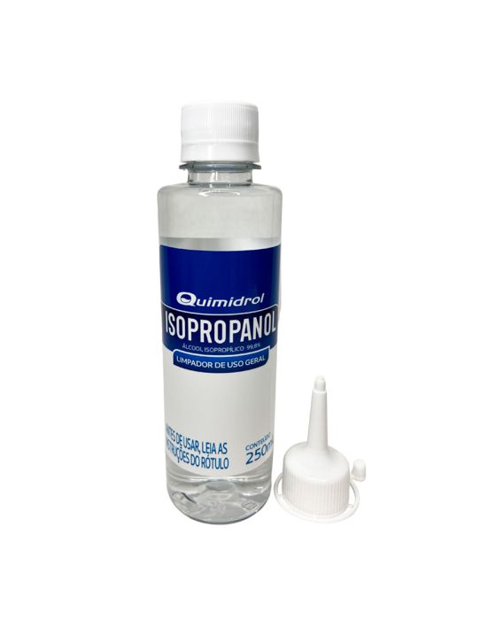 Características:O álcool isopropílico é um antimicrobiano potente, matando microrganismos ao inibir seu crescimento e interromper sua disseminação. Ele mata 99,99% dos germes em 10-30 segundos de sua aplicação, tornando-se uma das melhores ferramentas de esterilização.Detalhes:- Marca: Quimidrol;- Modelo: Isopropanol;- Linha: Álcool;- Tipo: Isopropilico;- Volume: 250ml;- Contém: 1 unidade do produto;- Possui bico dosador com tampa;- Limpador de uso geral.Aplicações: - Ideal para limpeza de produtos eletrônicos, peças feitas em impressoras 3D, acessórios como relógios, anéis e viseiras e solventes para tintas.Modo de uso:- Alicar o produto em um pano ou flanela e limpar o equipamento com cuidado;- Não aplique o prodito em superfícies sensíveis a álcool e certifique que aparelhos eletrônicos estejam desligados da corrente elétrica ou baterias.Redomendações:- A aplicação deve ocorrer em locais arejados ou com exaustão;- Usar luvas para manuseio do produto;- A inalação frequente pode causar dependência e danos irreversíveis à saúde;- Produto puro isento de água, o que não causa corrosão em componentes eletrônicos.Conservação:- Produto Inflamável;- Manter longe do fogo e superfícies aquecidas.Composição: - Fabricado com Álcool isopropílico (Isopropanol) puro.ATENÇÃO! MANTER FORTA DO ALCANCE DE CRIANÇAS E ANIMAIS DOMÉSTICOS.* As especificações podem ser alteradas sem aviso prévio ** Imagem meramente ilustrativa.