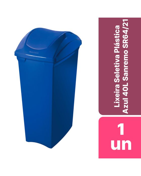 Características: A Lixeira com design elegante que otimiza espaço e inteligente: azul padrão universal de cor que identifica resíduos de papel. Possui pegas inferiores e superiores para encaixe das mãos, permitindo sempre o melhor esvaziamento. E mais: angulação da tampa basculante, que garante bom Volume da Caixa interno e faz bonito em qualquer ambiente.Detalhes:- Marca: Sanremo;- Modelo: Coleta Seletiva;- Referência: SR64/21;- Linha: Lixeiras;- Cor: Azul;- Identificação: Papel;- Capacidade: 40L;- Contém: 1 unidade do produto;- Esvaziamento fácil;- Pegas inferiores e superiores: fácil de manusear no dia a dia.Ideal para:- Ideal para uso em empresas, condomínios residenciais e empresariais.Composição: - Fabricado em Plástico.Medidas:- Dimensões do produto: 29,1 x 40,6 x 61,4cm (CxLxA);- Peso: g.* As especificações podem ser alteradas sem aviso prévio ** Imagem meramente ilustrativa.