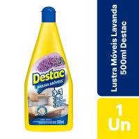 Características:Com o Brilha Móveis Destac você limpa e deixa seus móveis brilhando com um agradável perfume de longa duração. Sua avançada fórmula de Brilha Móveis Destac possibilita aplicação em azulejos, armários de fórmica, superfícies de mármore, vidros, espelhos, madeira tratada, plásticos, esmaltados e eletrodomésticos.Características:- Marca: Destac;- Fabricante: Reckitt Benckiser;- Linha: Brilha Móveis;- Fragrância: Lavanda;- Volume: 500ml;- Contém: 1 unidade do produto;- 3 em 1: Limpa, Perfuma e Dá brilho;- Proteção com silicone;Indústria Brasileira | Validade: 24 meses após a data de fabricação.Modo de usar:- Agite antes de usar, não aplicar em excesso, não precisa tirar o pó antes de aplicar o produto;- Aplique com um pano seco e limpo de maneira uniforme pela área desejada (não usar em pisos, escadas e madeiras não tratadas, e em eletrodomésticos não aplique diretamente sobre a superfície, aplique sobre um pano seco e limpo);- Lustre com um pano seco ou flanela limpa para realçar o brilho.Armazenagem:- Mantenha o recipiente herméticamente fechado em lugar ventilao;- Mantelha longe do fogo e superfícies aquecidas.Composição:- Silicone, Emulsificante, Espessante, Coadjuvante, Conservante, Fragrância, Solvente e Veículo.Medidas:- Dimensões do produto: 24 x 5,4 x 8,6cm (AxLxC);- Peso: 532g.ATENÇÃO! MATENHA FORA DO ALCANCE DAS CRIANÇAS E DOS ANIMAIS DOMÉSTICOS.* As especificações podem ser alteradas sem aviso prévio ** Imagem meramente ilustrativa.