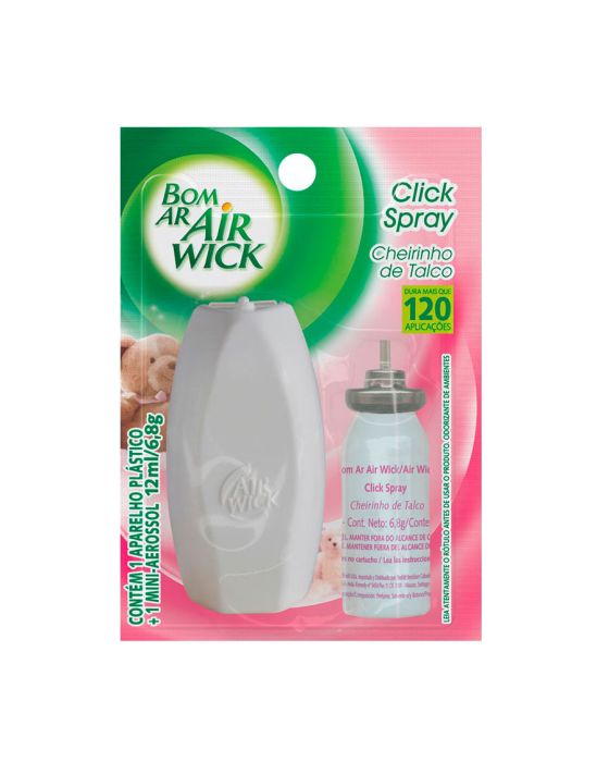 Caracteristicas:O Bom Ar® Click Spray é um aparelho moderno, discreto e prático, que se fixa facilmente às superfícies como paredes. Com apenas um clique, libera um cheiro suave e duradouro, eliminando os maus odores e proporcionando um agradável frescor ao seu banheiro.Detalhes:- Marca: Bom Ar®.- Modelo: Click Spray.- Linha: Odorizador de ar.- Fragrância: Cheirinho de talco.- Contém 1 Aparelho + 1 Refil 12ml.- Formato: Aerossol. - Volume do refil: 12ml.- Peso líquido: 6,8g.- Medidas: 9,5 x 2,2 x 13,5 cm.- Elimine os maus odores do banheiro.- Perfumação que dura mais de 120 aplicações. - Aparelho com design discreto que se fixa facilmente às superfícies.Onde usar:- Sala de estar, cozinhas, banheiros e outros ambientes internos.Modo de uso:- Levante a tampa plástica do seu aparelho click spray, e retire o tubo vazio.- Insira o tubo até ouvir o clique do encaixe.- Feche a tampa.ATENÇÃO! CONSERVE FORA DO ALCANCE DAS CRIANÇAS E DOS ANIMAIS DOMÉSTICOS.* As especificações podem ser alteradas sem aviso prévio ** Imagem meramente ilustrativa