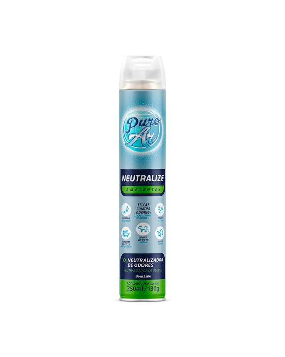 Características: O Neutralize Ambientes Puro Ar foi desenvolvido especialmente para aquelas situações em que há um odor incômodo no ambiente, agindo de forma a inibir o mau cheiro e deixar o ar mais leve e agradável, sem perfume, apenas mais natural. Ideal para eliminar odores como: cigarro, urina de pet, suor, mofo e frituras de peixe. Neutralize cheiros indesejáveis com Puro Ar! Detalhes:- Marca: Puro Ar;- Linha: Neutralizadores de Ar;- Tipo: Aerossol;- Fragrância: Neutro;- Volume/Peso: 250ml / 130g;- Contém: 1 unidade do produto;- Neutraliza odor de fritura, cigarro, urina de pet e mofo.Indústria Brasileira | Validade: 2 anos após a data de fabricação.Modo de usar:- Agite bem a embalagem antes de cada aplicação;- Pulverize sempre o jato para cima no ambiente, evitando dirigir sobre pessoas, plantas, animais, alimentos, paredes, tecidos, chamas ou superfícies aquecidas.Precauções:- Não ingerir;- Evite a inalação ou aspiração, contato com os olhos e contato com a pele;- Cuidado, inflamável! - Mantenha longe do fogo e de superfícies aquecidas;- Não perfurar a embalagem vazia;- Não jogue no fogo ou incinerador;- Não exponha à temperatura superior a 50ºC;- Mantenha o produto em sua embalagem original;- Não reutilizar a embalagem vazia. Composição: - Isopropanol, Solvente trietilenoglicol, ethylene brasylate e propelente.ATENÇÃO! CONSERVE FORA DO ALCANCE DAS CRIANÇAS E DOS ANIMAIS DOMÉSTICOS.* As especificações podem ser alteradas sem aviso prévio ** Imagem meramente ilustrativa.
