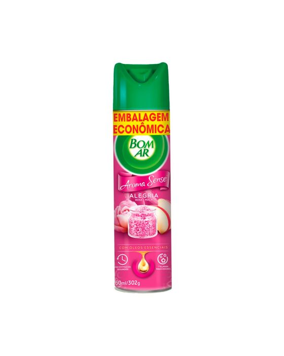 Caracteristicas:O Bom Ar Aroma Sense Alegria foi especialmente formulado com delicadas e exclusivas fragrâncias que perfumam suavemente o ar da sua casa, trazendo fragrâncias que transformam o ambiente e seu estado de espirítoA versão Alegria estimula a positividade e a felicidade em sua casa.Detalhes:- Marca: Bom Ar- Modelo: Aroma Sense- Quantidade: 630ml- Peso: 302g- Contém: 1 unidade- Fragrância: Alegria (Rosa + maçã)- Com óleos essenciais- Age em poucos segudos- Neutraliza maus odores- Embalagem Econômica.Onde usar:- Em ambientes onde se desejar usarModo de usar:- Agite bem antes de usar para garanir a performance do produto- APLIQUE NO EMBIENTE: Posicione o dedo no centro do gatilho da tampa e pulverize o produto para cima, evitando direcionar sobre pessoas, plantas, animais, alimentos, paredes, tecidos, chamas ou superfícies aquecidas- DISTÂNCIA: Mantenha pelo menos 30cm de distância de móveis e superfícies de madeira.* Use como orientado, aplicar em ambiente ventilado. Composição: - Emulsificante, Antioxidante, Fragrância, Veículo e Propelentes. Conservação:- Não jogar no fogo e nem expor a temperaturas superior a 50°C- Manter o produto em sua embalagem original- Mantenha a embalagem fechada e em ambiente ventilado.CONSERVE FORA DO ALCANCE DAS CRIANÇAS E DOS ANIMAIS DOMÉSTICOS!!* As especificações podem ser alteradas sem aviso prévio ** Imagem meramente ilustrativa.