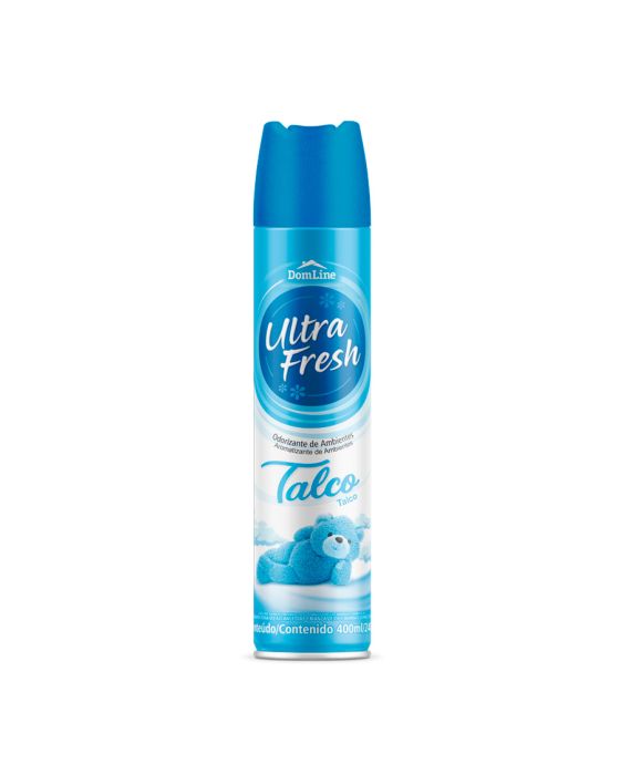 Caracteristicas:O Ultra Fresh Talco foi desenvolvido e formulado com exclusivas fragrâncias para refrescar o seu ambiente, deixando os locais suavemente perfumados. É recomendado o uso em locais como banheiros, quartos, salas e escritórios.Detalhes:- Marca: Ultra Fresh.- Fabricante: Dom Line.- Modelo: Odorizador de ambientes.- Linha: Aerossol.- Fragrância: Talco.- Quantidade: 400ml.- Peso: 240g.- Contém: 1 unidade do produto.Modo de usar:- Agite bem a embalagem antes e durante o uso.- Pulverize sempre o jato para cima no ambiente, evitando dirigir sobre pessoas, plantas, animais, alimentos, paredes, tecidos, chamas ou superfícies aquecida.Conservação:- Não expor a temperatura superior a 50°C.- Mantenha longe do fogo e de superfícies aquecidas.- Mantenha o recipiente hemeticamente fechado em lugar ventilado.- Manter o produto em sua embalagem original. Não reutilizar embalagens vazias.- Mantenha ao abrigo de luz solar.- Não deixar a embalagem em veículos, risco de explosão ou vazamentos.Composição:- Álcool etílico, antioxidantes, conservantes, coadjuvante, fragrância, veículo e propelente.O fabricante não se rsponsabiliza pelo uso incorreto do produto!PRODUTO SANEANTE NOTIFICADO NA ANVISA: Nº 25351698306200980.* As especificações podem ser alteradas sem aviso prévio** Imagem meramente ilustrativa *** CONSERVE FORA DO ALCANCE DAS CRIANÇAS E DOS ANIMAIS DOMÉSTICOS.