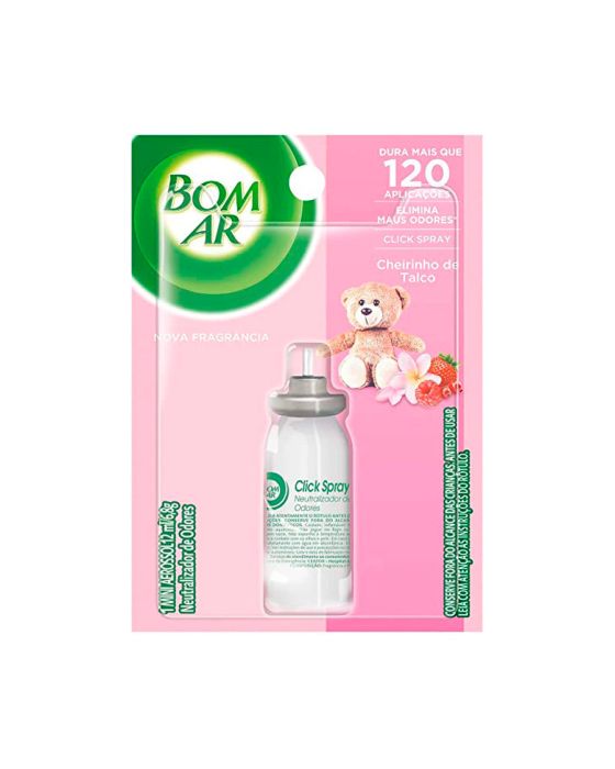 Caracteristicas:O cheirinho de talco remete à sensação de carinho e cuidado. O Bom Ar® Click Spray Cheirinho de Talco proporciona esse sentimento enquanto elimina os maus odores de banheiro.- Elimina maus odores de banheiro- Dura mais que 120 aplicações- Perfuma em apenas um click- Design discreto e moderno- Refil de 12ml/6,8g- Fragrância: Cheirinho de talcoInformações de uso1. Levante a tampa plástica do seu aparelho Bom Ar® Click Spray e insira o tubo novo até ouvir o clique do encaixe. Feche a tampa.2. Vaporize: para perfurmar, aperte no local indicado. Um clique é suficiente para uma perfumação duradoura. Lave as mãos após a utilização do produto.3. Para retirar o aparelho não puxe, gire-o. * As especificações podem ser alteradas sem aviso prévio ** Imagem meramente ilustrativa.