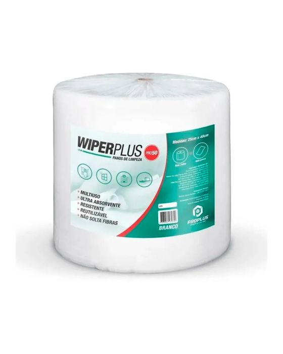 Caracteristicas:O WiperPlus PRO50 é multiuso, ultra absorvente, altamente resistente e reutilizável. Não causa irritação na pele e não tem reação com produtos químicos. Sua capacidade absoluta de absorção de água é de 4,8 ml/g e a velocidade de absorção de água (mm/30s) é de 4,3 segundos. Possui alta performance em limpezas com líquidos, possui baixa liberação de partículas, são resistentes a solventes e a rasgos. Fabricado com tecido produzido com a tecnologia de consolidação por hidro-entrelaçamento das fibras através de jatos de água de alta pressão, conhecido como spunlace.Especificações- Gramatura: 50g/m²- Cor: Branco- Rolo: 25cm x 240m (600 panos)- Unidade: 25cm x 40cm- Armazenagem: Manter em local limpo, seco, fresco, protegido da luz, da umidade e calor excessivo.- Composição: 80% fibras celulósicas e 20% polipropileno.Aplicações e indicaçõesRecomendado na limpeza e secagem de pisos e superfícies, bandejas, talheres, pratos, chapas, fornos, fogões e máquinas, aplicação de líquidos e solventes. Indicado para a limpeza rápida, prática e eficaz de indústrias, comércios, segmento alimentício e domiciliar. Ideal para locais onde é exigido o máximo de higiene. Conte com uma solução que limpa, dá brilho e não solta fiapos. O WIPERPLUS PRO50 é higiênico, não retém odores e é super prático para destacar.* As especificações podem ser alteradas sem aviso prévio ** Imagem meramente ilustrativa.