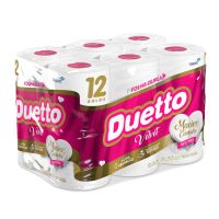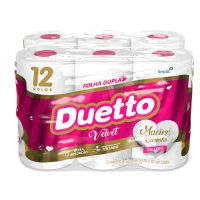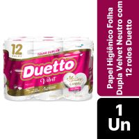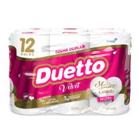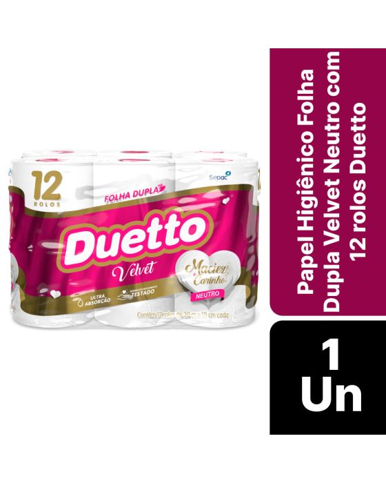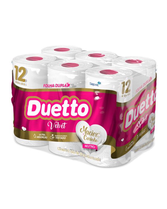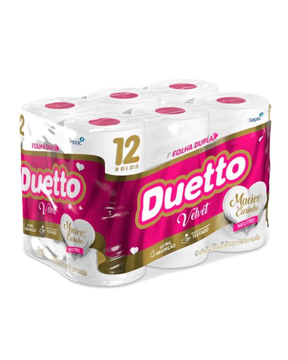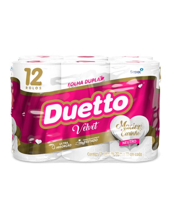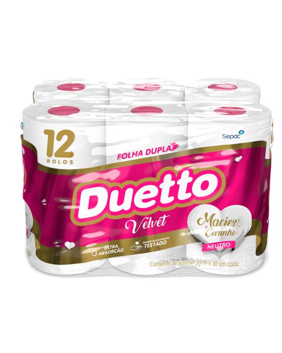 Características:O Duetto é produzido com matérias-primas de alta qualidade e tecnologia de última geração, garantindo mais conforto e segurança ao seu dia a dia. Produzido com uma nova tecnologia, o Duetto Velvet apresenta folhas duplas ainda mais macias e suaves ao toque. Disponível na versão Neutro com 30 metros, o produto reforça a qualidade já conhecida dos produtos da família Duetto com o diferencial do rolo cor-de-rosa.Detalhes:- Marca: Duetto;- Fabricante: Sepac;- Modelo: Velvet;- Linha: Papeis Higiênicos;- Tipo de folha: Neutro;- Folhas: Folha Dupla;- Cor: Branco;- Tamanho: 30m x 10cm cada rolo;- Quantidade de rolos: 12 rolos;- Contém: 1 embalagem com 12 unidades do produto;- Metros por rolo: 30 metros;- Dermatologicamente testado;- Folha dupla picotada e gofrada;- Rolinho cor-de-rosa;- Maciez do algodão;- Ultra Absorção;- Maciez e carinho.Indústria Brasileira. | Validade: Indeterminada.Ideal para:- Ideal para Banheiros e lavabos de empresas, escritórios, restaurantes, lanchonetes, panificadoras, confeitarias e demais comércios, além de residências.Conservação:- Conservar em local seco.Composição:- Fabricado com 100% fibras celulósicas;- Não contém extrato de algodão;Medidas:- Dimensões da folha (cada): 30m x 10cm;- Dimensões do rolo: 10 x 10 x 10cm (CxLxA);- Dimensões da embalagem: 29,7 x 21,5 x 19,8cm (CxLxA);- Peso: 754g.* Possui controle biológico: Método que permite remoção, redução e inibição do crescimento de microrganismos patógenos ou que causam deterioração do produto.* As especificações podem ser alteradas sem aviso prévio ** Imagem meramente ilustrativa.