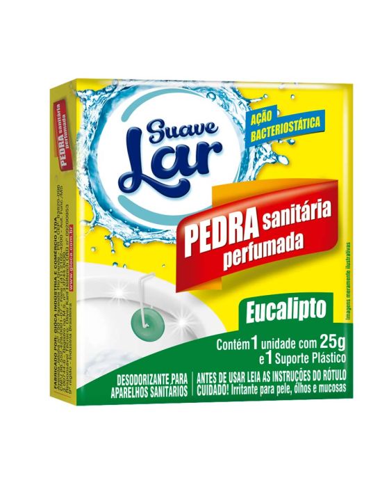 Caracteristicas:A Pedra Sanitária Suave Lar (desodorizante sanitário) possui ação bacteriostática, higieniza e perfuma todo o vaso sanitário a cada fluxo de descarga, deixando um agradável perfume de limpeza em seu banheiro.Detalhes:- Marca: Suave Lar.- Fabricante: Gióca.- Linha: Pedra Sanitária.- Fragrância: Eucalipto.- Peso: 25g.- Contém: 1 unidade de 25g e 1 suporte plástico.Modo de usar:- Aplicação: Abra o saco plástico e retire o refil. Em seguida, introduza o gancho no orifício central do produto. Coloque o conjunto na borda interna do vaso sanitário.- Ação: A pedra sanitária é constituída por uma mistura de essência, corante, paradiclorobenzeno e o ativo bacteriostático. O paradiclorobenzeno, que tem a propriedade de sofrer sublimação, permite separá-lo das demais substâncias. - A cada descarga o produto recebe um fluxo de água que arrasta o ativo produzindo uma solução que age e permanece no vaso, desodorizando e perfumando por muito mais tempo.Composição: - Paradiclorobenzeno, ativo bacteriostático, corante e essência. Teor de ativo: 0.4% de cloreto de benzalcônio.Armazenamento:- Conservar em temperatura ambiente, em local seco e fresco.ATENÇÃO! CONSERVE FORA DO ALCANCE DAS CRIANÇAS E ANIMAIS DOMÉSTICOS.* As especificações podem ser alteradas sem aviso prévio ** Imagem meramente ilustrativa