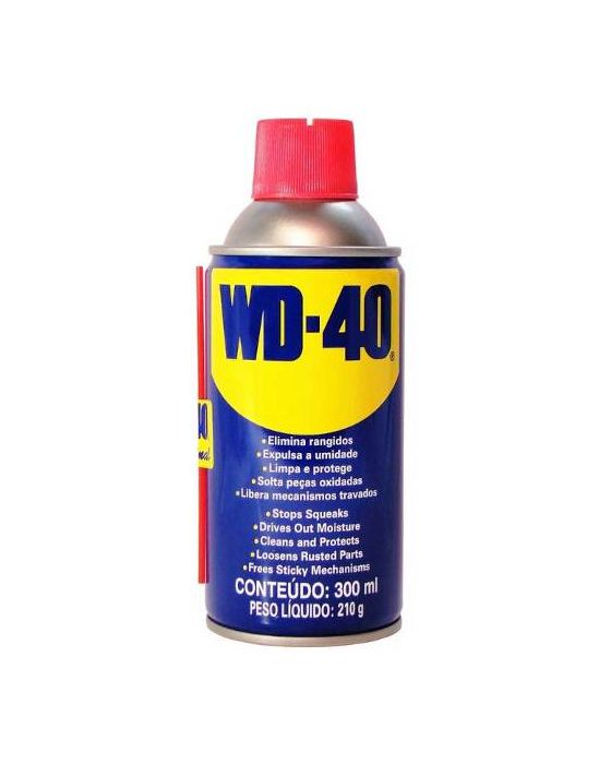 Caracteristicas:WD-40® Produto Multiusos 300ml Aerossol é o mais conhecido no Brasil. Ideal para usar em casa, no trabalho, no carro, etc. Possui válvula 180º exclusiva que permite o uso com a lata de cabeça para baixo. Com a ajuda do canudo extensor, alcance lugares de difícil acesso.O produto se originou da pesquisa por um protetor contra ferrugem e desengraxante para proteger peças de mísseis. O WD-40 foi criado em 1953 por três técnicos da San Diego Rocket Chemical Company. O nome vem do projeto, que tinha por objetivo desenvolver um composto para repelir água (water displacement).Eles tiveram sucesso com a quadragésima fórmula, portanto WD-40.A Corvair Compan adquiriu o composto a granel para proteger os componentes dos mísseis Atlas. Ken East (um dos Fundadores) disse que não há nada no WD-40 que seja prejudicial às pessoasSeguem alguns usos:- WD-40 Aerosol é o mais vendido no Brasil e tem 10 anos de validade e 60 anos de tradição. - Produto ideal para usar em casa, no trabalho, no carro, etc.- Possui válvula 180º exclusiva que permite o uso com a lata de cabeça para baixo. - Borrife diretamente as peças e superfícies para lubrificar, proteger, limpar, eliminar umidade e penetrar. Com a ajuda do canudo extensor, alcance lugares de difícil acesso.- Em conformidade com NBR 14725-4/2009- Elimina rangidos- Explusa a umidade- Limpa e protege- Solta peças oxidadas- Libera mecanismos travadosSaiba mais utilizações sobre o produto no site:http://www.wd40.com.br/maquinas_equipamentos.asp * As especificações podem ser alteradas sem aviso prévio ** Imagem meramente ilustrativa.