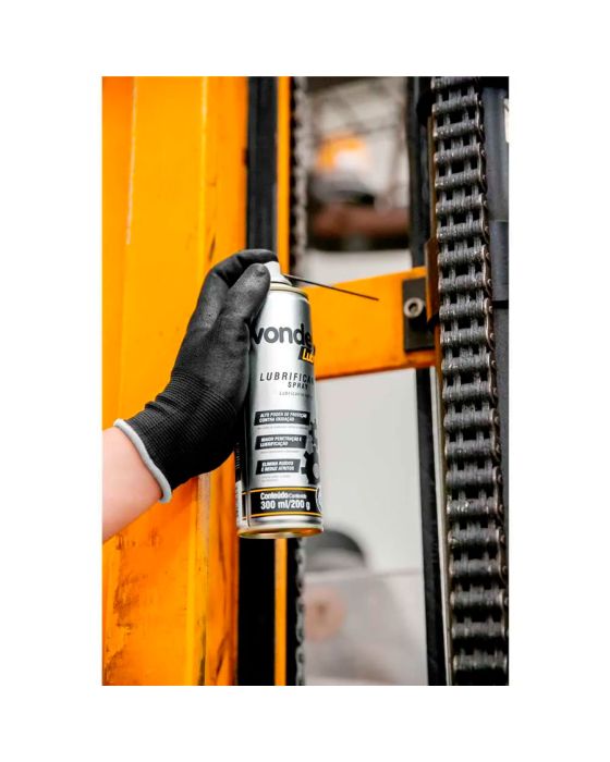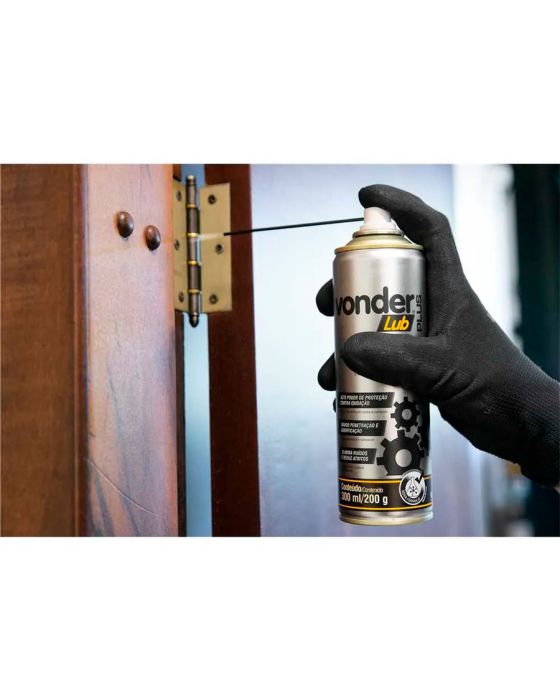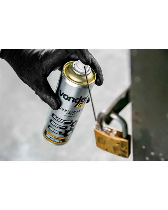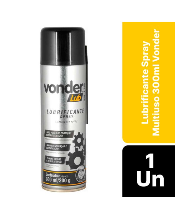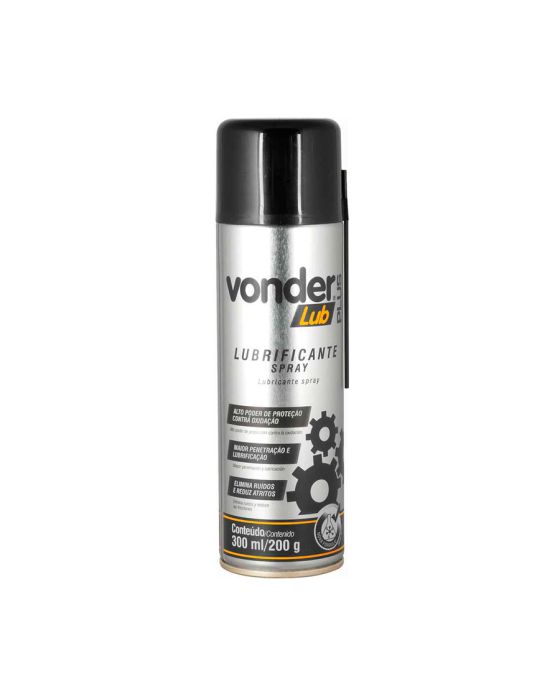 Características:Desengripante e protetor com fórmula exclusiva que possui alto desempenho nos testes de salt spray, resistência contra a corrosão. Possui elevada proteção contra oxidação, com penetração profunda, que facilita o desengripamento de peças, eliminação rápida de ruídos e redução de atrito, com agradável fragrância que evita desconfortos em sua utilização. Não agride plásticos e borrachas.Detalhes:- Marca: Vonder;- Modelo: Vonder Lub Plus;- Linha: Lubrificante;- Tipo: Spray;- Volume/Peso: 300ml / 200g;- Contém: 1 unidade do produto;- Possui bico prolongador;- Lubrifica, protege e desengripa;- Alto poder de proteção contra oxidação;- Maior penetração e lubrificação;- Elimina ruídos e reduz atritos.Indústria Brasileira. | Validade: 36 meses após a data de fabricação.Onde usar:- Indicado para peças e superfícies que necessitam de proteção contra oxidação. Utilizado para evitar ressecamento da borracha do motor, deixando aspecto de novo, e também em fechaduras, portas, parafusos, dobradiças, partes móveis em geral, cabos de embreagem, entre outros. Muito utilizado também para soltar com mais facilidade porcas e parafusos emperrados.Modo de uso:- Agite bem antes de usar;- Direcione o jato na superfície desejada;- Em locais de difícil acesso utilize o prolongador.Conservação:- Mantenha em local bem ventilado- Mantenha o recipiente hermeticamente fechado;- Armazene em local fechado a chave;- Mantenha ao abrigo da luz solar;- Não exponha a temperaturas superiores a 50°;- Lave as mãos cuidadosamente após o manuseio;- Utilize apenas ao ar livre ou locais bem ventilados.Composição:- Butano, destilados de petróleo levemente tratados com hidrogênio, propano, ceras parafínicas e ceras de hidrocarboneto.Medidas:- Dimensões do produto: 5,7 x 5,7 x 20,3cm (CxLxA);- Peso: 200g.ATENÇÃO! CONSERVAR FORA DO ALCANCE DE CRIANÇAS E ANIMAIS DOMÉSTICOS.* As especificações podem ser alteradas sem aviso prévio ** Imagem meramente ilustrativa.
