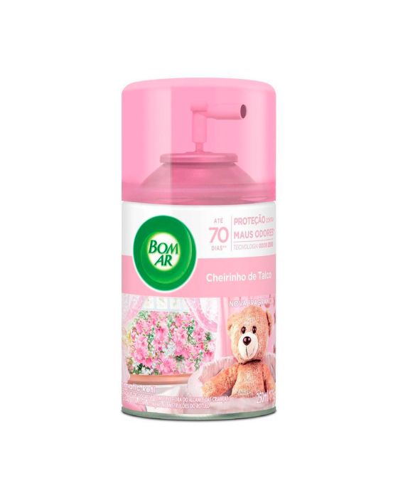 CaracterísticasBom Ar® Freshmatic Spray Automático Cheirinho de Talco elimina maus odores de qualquer ambiente entregando perfumação por até 70 dias e mantendo o ar fresco com o toque delicado do talco.- Elimina maus odores de animais domésticos, cozinha e banheiro- Mantém o ar fresco com perfumação contínua- Dura por até 70 dias- Embalagem com 250ml / 175gInformações de uso1. Abra a tampa superior do seu aparelho automático2. Verifique se o aparelho está desligado - a chave de controle deverá estar na posição desligado (indicada pelo ícone de .)3. Para inserir o refil: a) Abra o aparelho segurando a metade inferior e gire a metade superior no sentido anti-horário b) Insira o refil de aerossol na metade inferior do dispositivo c) Para fechar o dispositivo, coloque a metade superior sobre a metade inferior e gire no sentido horário para travar até ouvir um clique, garantindo que o bico pulverizador do refil está direcionado para o orífico frontal d) Verifique se o dispositivo está totalmente fechado4. A pilha deve ser colocada sob a tampa superior do dispositivo. Insira 1 pilha alcalina AA no compartimento e verifique se os terminais positivo (+) e negativo (-) estão alinhados corretamente 5. Quando ligado, o dispositivo pulveriza após 15 segundos6.Defina o controle da intensidade da fragrância de acordo com as necessidades da sua casa: baixo (a cada 36 minutos), médio (a cada 25 minutos) e alto (a cada 9 minutos)7.Escolha do local: escolha o local onde o aparelho será instalado e certifique-se de que está seguro. Posicione o aparelho respeitando a altura mínima de 2 metros do chão. Caso queira alterar a intensidade da fragrância depois da instalação, direcione o aparelho no sentido oposto a face e altere para a intensidade desejada no botão localizado abaixo da tampa na parte superior do aparelho8. O refil de aerossol deverá ser trocado quando a fragrância não for mais emitida. Afastando o dispositivo da face, deslize a chave de controle para a posição OFF. Substitua o refil de aerossol e selecione o nível de intensidade de fragrância escolhido * Adquira o Aparelho Purificador de Ar, sob Cód de referência 36387. ** As especificações podem ser alteradas sem aviso prévio *** Imagem meramente ilustrativa.