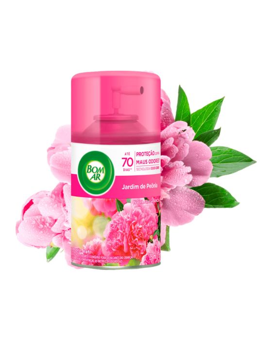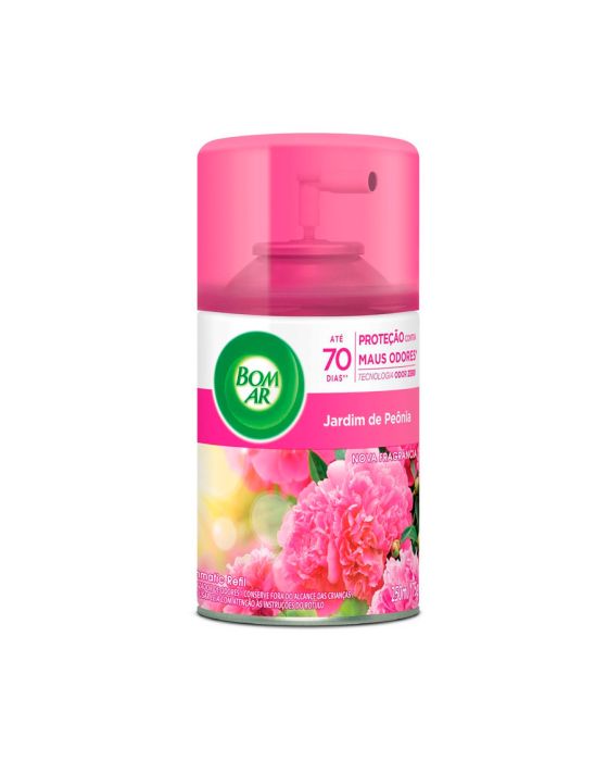 Características - Fragrância: Jardim de Peônia - Para uso no aparelho Bom Ar® Freshmatic Spray Automático - Contém 1 Refil 250ml O Aparelho pode ser regulado para funcionar a cada 09 / 25 / 36 minutos Podendo durar até 60 dias https://www.youtube.com/watch?time_continue=24&v=5r4Upwdq_xw&feature=emb_logo * Adquira o Aparelho Purificador de Ar, sob Cód de referência 36387 ** As especificações podem ser alteradas sem aviso prévio *** Imagem meramente ilustrativa.