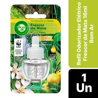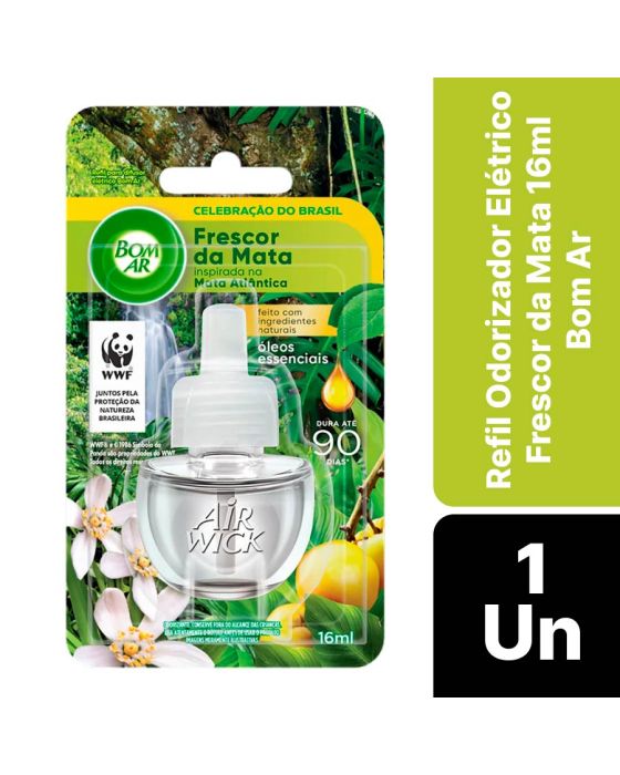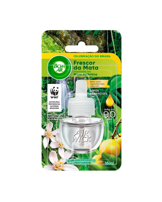 Características:Bom Ar® Difusor Elétrico Frescor da Mata tem fragrância inspirada na Mata Atlântica desenvolvida em parceira com o WWF-Brasil. Bom Ar Difusor Elétrico Frescor da Mata perfuma continuamente qualquer ambiente e é feita com ingredientes naturais e óleos essenciais, proporcionando sensação de bem-estarDetalhes:- Marca: Bom Ar®;- Fabricante: Reckitt Beckiser;- Linha: Difusores Elétrico;- Tipo: Refil;- Fragrância: Frescor da Mata;- Volume/Peso: 16ml;- Contém: 1 embalagem com 1 refil de 16ml;- Feito com ingredientes naturais;- Perfuma continuamente qualquer ambiente;- Dura até 90 dias.Indústria Brasileira. | Validade: Refil válido por 24 meses após a data de fabricação impressa na embalagem.Modo de uso:- Remova a tampa do frasco que contém o líquido;- Mantenha o frasco na posição vertical e insira no aparelho até ouvir um clique;- Introduza na tomada (110-240V ~5W). Se a sua tomada estiver na vertical, gire o plug do aparelho no sentido anti-horário para que ele fique posicionado na vertical;- De acordo com a necessidade, ajuste a fragrância – Há 5 níveis de ajuste:° Posição mínima – duração de até 45 dias (12h/dia);° Posição máxima – duração de até 30 dias (12h/dia).- Para retirar o frasco, retire o aparelho da tomada e puxe-o ligeiramente para baixo;* Para ambientes maiores que 28m², pode ser necessária a utilização de mais de um aparelho elétrico Bom Ar.Conservação:- Em caso de não utilizar o frasco durante algum tempo, coloque a tampa e guarde-o em lugar seco e fresco.Composição:- Fragrância.Medidas:- Dimensões da embalagem: 13,4 x 7,4 x 3,8cm (CxLxA);- Peso: 253g.* As especificações podem ser alteradas sem aviso prévio ** Imagem meramente ilustrativa.