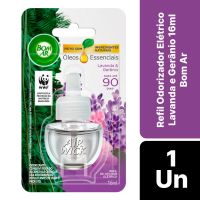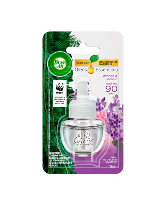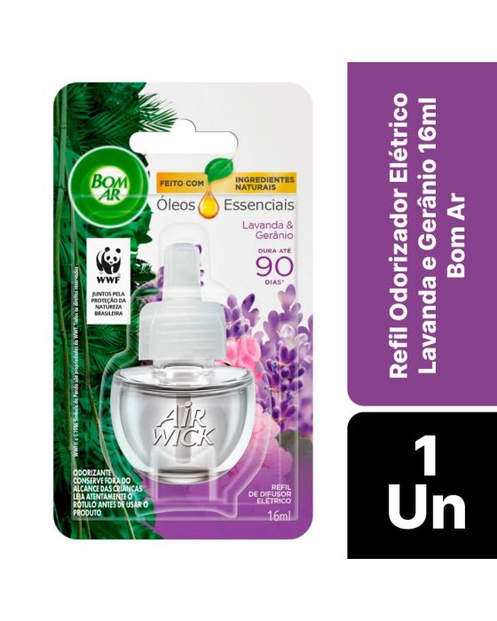 Características:Bom Ar® Difusor Elétrico Lavanda e Gerânio perfuma continuamente qualquer ambiente. A sutileza da lavanda e o frescor do gerânio combinados em óleos essenciais são capazes de tornar o clima da sua casa aconchegante com um ar fresco que lembra a natureza.Detalhes:- Marca: Bom Ar®;- Fabricante: Reckitt Beckiser;- Linha: Difusores Elétrico;- Tipo: Refil;- Fragrância: Lavanda e Gerânio;- Volume/Peso: 16ml;- Contém: 1 embalagem com 1 refil de 16ml;- Feito com ingredientes naturais;- Perfuma continuamente qualquer ambiente;- Dura até 90 dias.Indústria Brasileira. | Validade: Refil válido por 24 meses após a data de fabricação impressa na embalagem.Modo de uso:- Remova a tampa do frasco que contém o líquido;- Mantenha o frasco na posição vertical e insira no aparelho até ouvir um clique;- Introduza na tomada (110-240V ~5W). Se a sua tomada estiver na vertical, gire o plug do aparelho no sentido anti-horário para que ele fique posicionado na vertical;- De acordo com a necessidade, ajuste a fragrância – Há 5 níveis de ajuste:° Posição mínima – duração de até 45 dias (12h/dia);° Posição máxima – duração de até 30 dias (12h/dia).- Para retirar o frasco, retire o aparelho da tomada e puxe-o ligeiramente para baixo;* Para ambientes maiores que 28m², pode ser necessária a utilização de mais de um aparelho elétrico Bom Ar.Conservação:- Em caso de não utilizar o frasco durante algum tempo, coloque a tampa e guarde-o em lugar seco e fresco.Composição:- Fragrância.Medidas:- Dimensões da embalagem: 13,4 x 7,4 x 3,8cm (CxLxA);- Peso: 253g.* As especificações podem ser alteradas sem aviso prévio ** Imagem meramente ilustrativa.