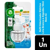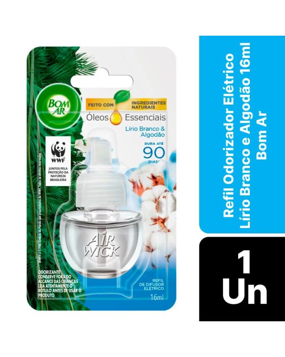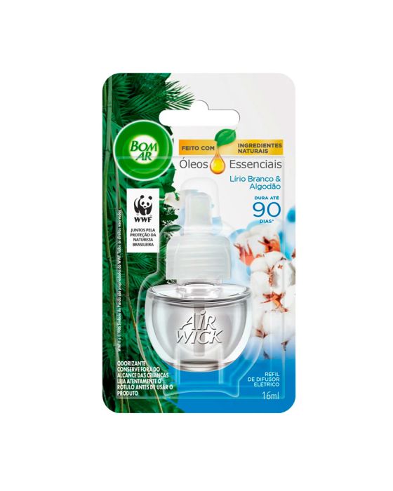 Características:O Bom Ar® Difusor Elétrico Lírio Branco e Algodão perfuma continuamente qualquer ambiente. A delicadeza do lírio branco e o frescor do algodão combinados em óleos essenciais são capazes de tornar o clima da sua casa aconchegante e fresco, trazendo a sensação de proximidade com a natureza.Detalhes:- Marca: Bom Ar®;- Fabricante: Reckitt Beckiser;- Linha: Difusores Elétrico;- Tipo: Refil;- Fragrância: Lírio Branco e Algodão;- Volume/Peso: 16ml;- Contém: 1 embalagem com 1 refil de 16ml;- Feito com ingredientes naturais;- Perfuma continuamente qualquer ambiente;- Dura até 90 dias.Indústria Brasileira. | Validade: Refil válido por 24 meses após a data de fabricação impressa na embalagem.Modo de uso:- Remova a tampa do frasco que contém o líquido;- Mantenha o frasco na posição vertical e insira no aparelho até ouvir um clique;- Introduza na tomada (110-240V ~5W). Se a sua tomada estiver na vertical, gire o plug do aparelho no sentido anti-horário para que ele fique posicionado na vertical;- De acordo com a necessidade, ajuste a fragrância – Há 5 níveis de ajuste:° Posição mínima – duração de até 45 dias (12h/dia);° Posição máxima – duração de até 30 dias (12h/dia).- Para retirar o frasco, retire o aparelho da tomada e puxe-o ligeiramente para baixo;* Para ambientes maiores que 28m², pode ser necessária a utilização de mais de um aparelho elétrico Bom Ar.Conservação:- Em caso de não utilizar o frasco durante algum tempo, coloque a tampa e guarde-o em lugar seco e fresco.Composição:- Fragrância.Medidas:- Dimensões da embalagem: 13,4 x 7,4 x 3,8cm (CxLxA);- Peso: 253g.* As especificações podem ser alteradas sem aviso prévio ** Imagem meramente ilustrativa.