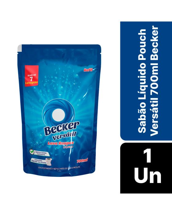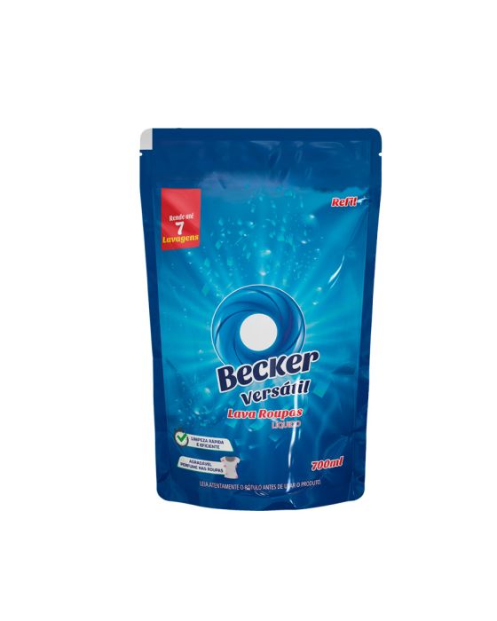 Características:- Limpeza eficiente com praticidade e economia: O Refil Sabão Líquido Pouch Versátil 700ml Becker foi desenvolvido para oferecer alto desempenho na remoção de sujeiras e manchas, garantindo roupas limpas, macias e com perfume agradável. Sua formulação equilibrada promove uma limpeza rápida e eficaz, ideal para lavanderias profissionais, hotéis, hospitais, clínicas e empresas de limpeza que buscam eficiência com redução de custos e menor geração de resíduos.- Fórmula concentrada e de alta performance: Com rendimento de até 7 lavagens, o sabão líquido Becker atua de forma profunda nas fibras do tecido, removendo sujeiras e odores sem agredir as roupas. Sua composição contém ácido linear alquil benzeno sulfônico, laurel éter sulfato de sódio, neutralizante, coadjuvante, espessantes, fragrância, conservante, corante e veículo, proporcionando equilíbrio entre poder de limpeza, espuma controlada e fragrância duradoura.- Embalagem prática e sustentável: A embalagem pouch refil de 700ml foi projetada para facilitar o reabastecimento e reduzir o consumo de plástico, tornando o produto uma opção sustentável e econômica. Essa apresentação otimiza o espaço de armazenamento e o transporte, atendendo empresas que buscam eficiência logística e menor impacto ambiental.- Perfume agradável e uso profissional: Além de limpar profundamente, o sabão líquido Becker deixa um perfume suave e prolongado nas roupas, reforçando a sensação de frescor e cuidado. A dosagem é simples e prática: 100ml para lavagens em máquinas de até 8kg e 150ml para máquinas de maior capacidade. Em manchas localizadas, o produto pode ser aplicado diretamente sobre o tecido antes da lavagem para melhores resultados.- Marca de tradição e confiança: A Becker é reconhecida no mercado de limpeza e cuidados têxteis pela qualidade e eficiência de seus produtos.- Dimensões da embalagem: Comprimento: 13cm; Largura: 0,8cm; Altura: 26cm; Peso: 744g. IMPORTANTE! CONSERVAR FORA DO ALCANCE DAS CRIANÇAS E DOS ANIMAIS DOMÉSTICOS.* As especificações podem ser alteradas sem aviso prévio ** Imagem meramente ilustrativa.