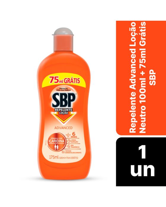 Características:O Repelente corporal loção de longa duração com icaridina em sua fórmula. Oferece proteção contra os insetos voadores, inclusive o mosquito que transmite dengue, zika e chikungunya. é a base de água, sem fragrância e testado dermatologicamente.Detalhes:- Marca: SBP;- Linha: Repelente Corporal;- Tipo: Líquido;- Fragrância: Sem fragrância;- Volume/Peso: 175ml (100ml + 75ml Grátis);- Contém: 1 unidade do produto com 175ml;- Idade indicada: A partir de 6 meses;- Duração: Até 5 horas;- Embalagem promocional;- Fórmula com Icaridina;- Textura agradável e fácil aplicação;- Seca rápido;- Uso de dia e de noite;- Longa duração;- Testado dermatologicamente.Indústria Brasileira. | Validade: Válido por 36 meses após a data de fabricação impressa na embalagem.Modo de uso:- Agite bem antes de usar;- Aplicar nas partes expostas do corpo somente quando necessário;- Para aplicar no rosto, aplique primeiramente o produto nas mãos e a seguir leve ao rosto;- Lavar as mãos com água e sabão após o uso;- Reaplicar o produto após o contato com água ou transpiração excessiva.Recomendação:- Não utilizar se a pele estiver irritada ou lesionada;- Não aplicar na região dos olhos, boca e mucosas;- Não reutilizar a embalagem vazia;- Não aplicar em crianças menores de 6 meses de idade;- Após a aplicação, não se aproximar de fogo, fonte de calor ou ignição até que o produto seque completamente na pele;- Não guarde a temperaturas superiores a 50°c, próximo a chamas, exposto ao sol ou dentro de automóveis;- Para melhor eficácia, reaplicar o produto após 5 horas;- Para uso durante a gravidez e amamentação, consulte um médico. * Atenção: o uso de repelentes não dispensa nem substitui as demais medidas de combate às doenças transmitidas por mosquitos!Conservação:- Evite contato com olhos, boca e pele, caso tenha contato, lavar imediatamente com água em abundância;- Mantenha em lugar seco, fresco, arejado e ao abrigo da luz solar direta;- Não reutilize a embalagem vazia para outros fins;- Conservar o frasco bem fechado;- Não dê nada por via oral a uma pessoa inconsciente.Composição:- Icaridina 10% Composição: Hydroxyethyl Isobutyl Piperidine Carboxylate, Petrolatum, Acrylamide, Paraffinum Liquidum, Polysorbate 85, Cetearyl Alcohol, Steareth-10, Steareth-20, Sodivm Hydroxide, Benzyl Alcohol, Ethylhexylgiycerin, Tocopherol, Aqua.Medidas:- Dimensões da embalagem: 7 x 3,1 x 19,5cm (CxLxA);- Peso: 249g.IMPORTANTE! CONSERVAR FORA DO ALCANCE DE CRIANÇAS E ANIMAIS DOMÉSTICOS.* As especificações podem ser alteradas sem aviso prévio ** Imagem meramente ilustrativa.