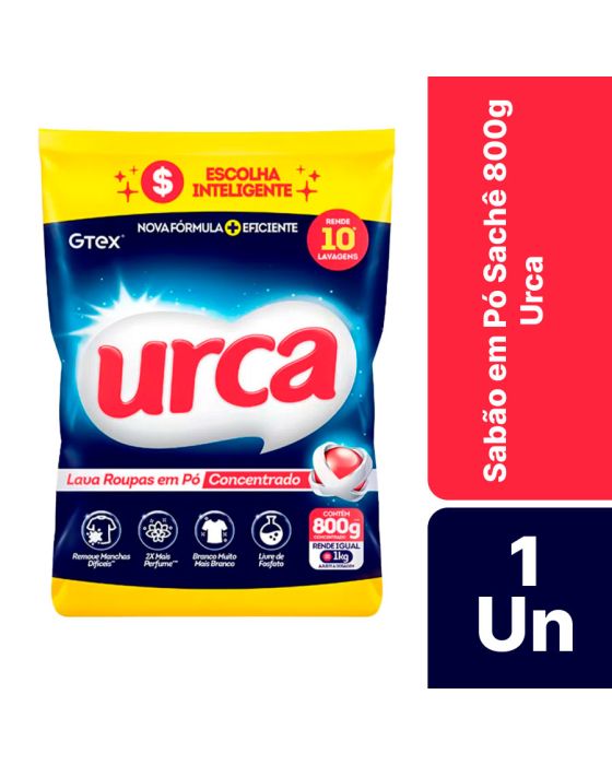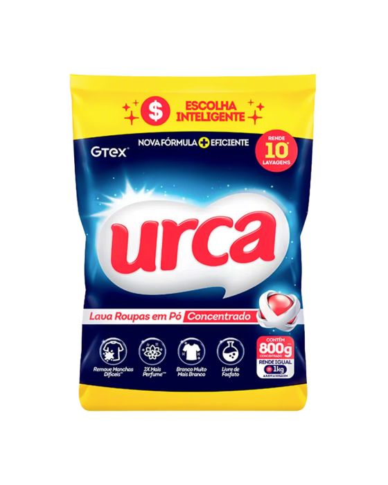 Características:O novo Lava Roupas em Pó Concentrado Urca tem Alta Performance de Limpeza e é ideal para o cuidado das suas roupas! Possui fórmula mais eficiente removendo as manchas mais difíceis, e duas vezes mais perfume! Possui maior poder de branqueamento, deixando as roupas brancas ainda mais brancas e é livre de fosfato, o que reduz o impacto ambiental a vida aquática.Detalhes: - Marca: Urca;- Modelo:- Linha: Sabão em Pó;- Tipo: Concentrado;- Peso: 800g;- Contém: 1 unidade do produto;- Remove as manchas mais difíceis;- 2 vezes mais perfume;- 800g com rendimento igual o de 1Kg;- Branco muito mais branco;- Lava uma máquina cheia;- Livre de fosfato.Indústria Brasileira.Modo de uso:- Encha o tanque ou a máquina com água e adicione a quantidade recomendada do produto;- Agite bem a solução para dissolver completamente o pó e coloque uma roupa de cada vez;- Tempo de molho ideal: 2 horas;- Prossiga a lavagem normalmente;- Enxaguar adequadamente e colocar para secar.Composição - Linear Aquil Benzeno Sulfonato de Sódio, Alcalinizantes, Coadjuvantes, Carga, Branqueador Óptico, Enzima, Corante, Fragrância e Veículo.Recomendações:- Detergentes em pó em geral não são adequados para lavagem de roupas de lã, seda, couro e algodão cru;- Detergentes com enzimas não devem ser misturados com alvejantes a base de cloro, como por exemplo água sanitária.Armazenamento e conservação: - Armazenar em local seco e arejado.Medidas:- Dimensões do produto: 15,5 x 4 x 20cm (CxLxA).CONSERVE FORA DO ALCANCE DAS CRIANÇAS E DOS ANIMAIS DOMÉSTICOS.* As especificações podem ser alteradas sem aviso prévio ** Imagem meramente ilustrativa.