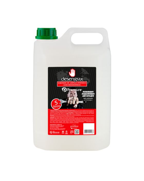 Caracteristicas:O Sabonete Desengrax Limpeza Intensiva com Microesferas possui uma fórmula cuidadosamente balanceada com a finalidade de remover as sujidades mais difíceis, como óleos e compostos graxos em geral. Contém uma nobre fragrância que proporciona uma agradável sensação de bem estar. Extra limpeza: os resíduos de remoção mais difíceis são eliminados pela ação de microesferas - Galão de 5000ml - Sabonete Líquido Desengrax 5Lt PREMISSE - Sabonete para limpeza intensiva. - Possui uma fórmula cuidadosamente balanceada, com a finalidade de remover as sujidades mais difíceis, como óleos e compostos graxos em geral. - Sua formulação não contém abrasivos, proporcionando uma limpeza sem agredir a pele, deixando-a macia e sedosa. - Tem aplicação em oficinas, cozinhas, industriais, restaurantes, hotéis, hospitais, lavabos e etc. - Embalagem: Galão de 5 litros - Dimensões: A x L x P / 26,1 x 16,7 x 14 cm - Marca: Premissé - Peso: 5,102 kgPara consultar a FDS (Ficha com Dados de Segurança), acesse (copiar e colar no navegador):https://preview--consultafdscontabilista.base44.app/share?product_id=62384 * As especificações podem ser alteradas sem aviso prévio ** Imagem meramente ilustrativa