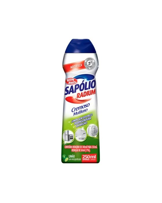 Carateristicas:Limpador em creme, Limpa e dá brilho sem riscar, não existe nada mais eficiente para acabar com a gordura acumulada nas panelas, frigideiras, assadeiras, grelhas e peças do fogão do que Sapólio Radium Cremoso Original. Você usa e a sujeira desaparece de vez, deixando os utensílios limpos e brilhando, como se fossem novos. Sapólio Radium existe há mais de 40 anos e ainda é o melhor na limpeza pesada.DICA: - Metais: pás, talheres, maçanetas, torneiras e outras peças ficam lindas quando tratadas com Sapólio Radium Cremoso. Faça o teste! - Tênis: para limpar tênis branco de couro, use a Esponja Bom Bril Multiuso com um pouquinho de Sapólio Radium Cremoso. Retire com um pano úmido e deixe secar à sombra. - Variedade: Saponáceo Cremoso - Versão: Limão - Capacidade: 250mL - Marca: Sapólio Radium - Fabricante: BombrilCOMPOSIÇÃO: Tensoativos aniônicos e não iônicos, espessante, alcalizantes, abrasivo, preservante, pigmentos, fragrância e veículo. Componente ativo linear alquilbenzeno sulfonato de sódio. * As especificações podem ser alteradas sem aviso prévio ** Imagem meramente ilustrativa
