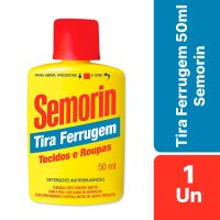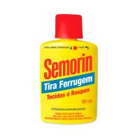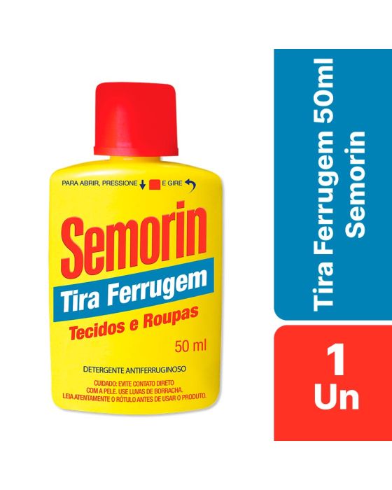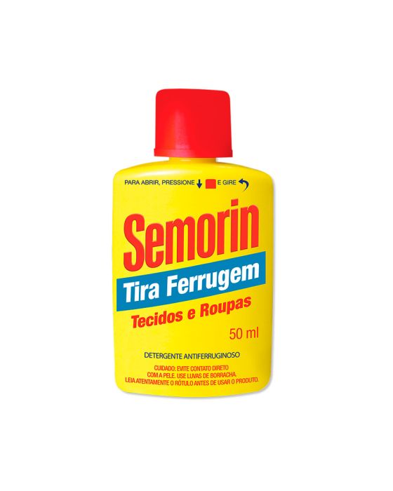 Características:O tira ferrugem para tecidos mais vendido do BrasilTira ferrugem Semorin é pioneiro: foi o primeiro tira ferrugem lançado no Brasil a mais de 50 anos de mercado, Semorin tira ferrugem rapidamente se tornou sinônimo da categoria pela sua eficiência e desempenho na remoção de manchas de ferrugem em tecidos. É o líder de vendas e referência de qualidade em todo território nacional e até no exterior.Conta com exclusiva tampa de segurança que evita acidentes no manuseio, mas mantém a simplicidade para utilizar: basta apertar a tampa no sentido inferior (sentido do frasco – para baixo) e depois girar em sentido anti-horário.Detalhes:- Marca: Semorin;- Modelo: Tira ferrugem;- Volume: 50ml;- Contém: 1 unidade do produto;- O mais vendido do Brasil.Indústria Brasileira | Validade: 36 meses após a data de fabricação.Modo de uso:- Aplique algumas gotas do Tira Ferrugem Semorin sobre a mancha de ferrugem;- Aguarde 5 minutos para fazer efeito;- Enxágue com água em abundância.Armazenamento:- Conservar o frasco em local fresco, ventilado e protegido do sol e do calor.Cuidados:- Evite contato direto com a pele;- Use luvas de borracha;- Leia atentamente o rótulo do produto antes do uso;- Cuidado no manuseio - contém ingrediente ácido;- Não ingira, não inale nem aspire. Não deixe entrar em contato com os olhos e com a pele;- Não reutilize a embalagem vazia.Orientações:- Não passar o ferro antes de enxaguar;- Aplicar somente em tecidos;- Em tecidos coloridos testar em local não visível antes de usar;- Não usar em tecidos nas cores bege e cáqui;- Não aplicar sobre vidros, cristais , superfícies vitrificadas (mármore e granito) ou esmaltados, metais, pisos e congênere.Composição: - Amina Graxa Etoxilada, Acidificantes, Coadjuvantes, Alcalinizante, Solvente, Atenuador de espuma e Veículo.Medidas:- Dimensões do produto: 4,9 x 2,7 x 9cm (CxLxA);- Peso: 0,064g.CONSERVE FORA DO ALCANCE DE CRIANÇAS E ANIMAIS DOMÉSTICOS.* As especificações podem ser alteradas sem aviso prévio ** Imagem meramente ilustrativa.
