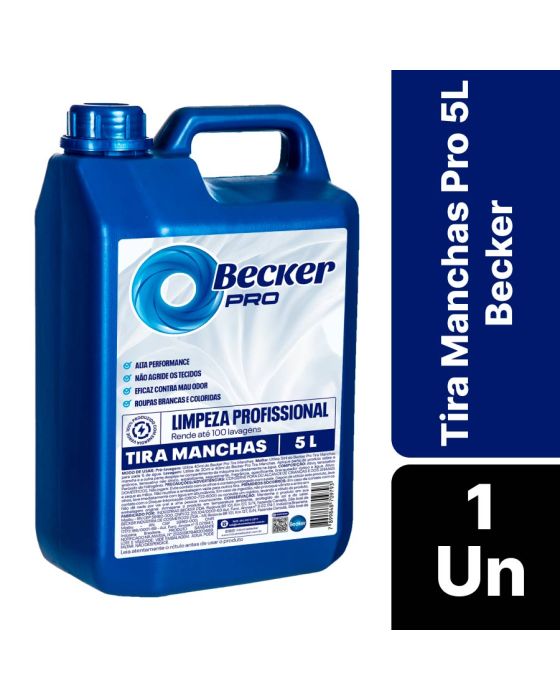 Características:- Remoção profissional de manchas com eficiência e segurança: O Tira Manchas Pro 5L Becker é um produto técnico desenvolvido para uso profissional em lavanderias, hotéis, hospitais, indústrias têxteis e empresas de limpeza que demandam alta performance na remoção de manchas e odores. Sua fórmula avançada garante limpeza profunda e ação oxidante controlada, eliminando resíduos orgânicos, sujeiras difíceis e odores, sem danificar as fibras dos tecidos — ideal para roupas brancas e coloridas.- Formulação técnica de alto desempenho: Composto por peróxido de hidrogênio, tensoativos aniônicos e não iônicos, agentes estabilizantes e branqueadores ópticos, o Tira Manchas Becker Pro atua por oxidação segura, quebrando moléculas de sujeira e manchas persistentes, como café, vinho, sangue, gordura e molhos. Sua ação equilibrada remove impurezas sem desbotar as cores, mantendo o aspecto e a durabilidade dos tecidos mesmo após diversos ciclos de lavagem.- Versatilidade e praticidade de uso profissional: Projetado para atender processos industriais e institucionais, o produto pode ser utilizado de três formas: Pré-lavagem: aplicar 40 ml diretamente sobre a mancha para ação localizada; Molho: diluir 5 ml por litro de água para pré-tratamento de roupas com sujeira intensa; Lavagem: utilizar entre 20 ml e 40 ml no compartimento da máquina ou diretamente na água, conforme o grau de sujeira. Seu rendimento é de até 100 lavagens por galão, garantindo ótimo custo-benefício e eficiência operacional.- Indicado para ambientes corporativos e institucionais: O Tira Manchas Pro Becker é ideal para lavanderias comerciais, hotéis, clínicas, hospitais, restaurantes e indústrias de uniformes, onde há necessidade de higienização completa, remoção de manchas persistentes e controle de odores. Sua composição balanceada contribui para processos de limpeza sustentáveis, com menor necessidade de retrabalho e redução no consumo de água e energia.- Marca de tradição e confiança: A Becker é reconhecida no mercado de limpeza e cuidados têxteis pela qualidade e eficiência de seus produtos.- Dimensões do produto: Comprimento: 18cm; Largura: 13,5cm; Altura: 28,5cm; Peso: 5,05kg. IMPORTANTE! CONSERVAR FORA DO ALCANCE DAS CRIANÇAS E DOS ANIMAIS DOMÉSTICOS.* As especificações podem ser alteradas sem aviso prévio ** Imagem meramente ilustrativa.