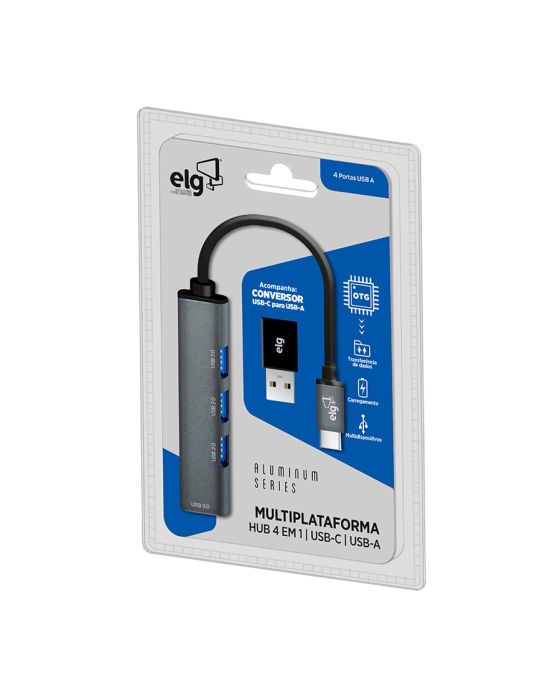 Características:- Expansão moderna e eficiente de conexões: O HUB USB 4 em 1 HUB41A-V2 ELG é a escolha ideal para ampliar a conectividade de seus dispositivos, transformando uma única porta USB-C em quatro saídas USB-A. Compacto e portátil, conta com design moderno e corpo em alumínio, garantindo resistência, durabilidade e estilo em um único acessório. Para maior versatilidade, acompanha adaptador USB-C para USB-A, permitindo também o uso em dispositivos que utilizam este tipo de entrada.- Alto desempenho em múltiplas portas: O modelo oferece quatro portas independentes, sendo uma USB 3.0 com velocidade de até 5 Gbps para transferências rápidas e três portas USB 2.0 com até 480 Mbps, ideais para periféricos como mouses, teclados, controles de jogos, pendrives e outros acessórios. Todas as portas suportam tecnologia OTG, possibilitando tanto o carregamento de dispositivos quanto a transferência de dados de forma simultânea.- Compatibilidade prática e universal: O HUB41A-V2 é compatível com os principais sistemas operacionais, incluindo Windows XP, 7, 8, 10, macOS 10.2.8 ou superior e Linux. Sua instalação é simples e rápida no modo Plug & Play, sem a necessidade de softwares ou drivers adicionais. Com cabo de 10 cm e alimentação via USB, dispensa pilhas ou tomadas, oferecendo praticidade para uso em casa, no escritório ou em viagens.- Marca de confiança: A ELG é reconhecida no mercado por oferecer soluções inovadoras em acessórios eletrônicos, com foco em tecnologia, funcionalidade e durabilidade.- Itens inclusos na embalagem: 1 Hub com 4 portas e 1 adaptador USB-C para USB-A.- Garantia do fornecedor: Garantia limitada de 1 ano contra defeitos de fabricação.- Dimensões da embalagem:Comprimento: 16,5cm;Largura:11cm;Altura: 1,5cm;Peso: 59g.* As especificações podem ser alteradas sem aviso prévio ** Imagem meramente ilustrativa.