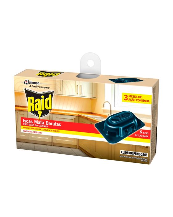 Caracteristicas:Mantenha baratas afastadas por até 3 meses com a ação contínua do Raid Iscas. O produto elimina até mesmo as baratas que estão em ninhos.- Mata: Baratas- Contém 6 iscas de 2,6g cada- Não deixa resíduosModo de usar1. Abra o plástico que contém as iscas.2. Use as 6 iscas ao mesmo tempo para controlar infestação. Coloque 4 iscas na cozinha e 2 no banheiro ou na área de serviço.3. Coloque as iscas onde as baratas costumam andar: perto de ralos e embaixo de pias, armários e geladeiras.4. Para melhores resultados, coloque as iscas perto de paredes e cantos.5. Para infestações mais graves, recomendamos o uso de 10 a 12 iscas adicionais na cozinha e 2 a 4 em cada banheiro.6. Substitua as iscas a cada três meses para evitar que as baratas voltem. Descarte as iscas usadas.DICA: Para melhores resultados no combate a baratas, utilize também Raid Mata Baratas e Formigas (ID 73924).* As especificações podem ser alteradas sem aviso prévio ** Imagem meramente ilustrativa.