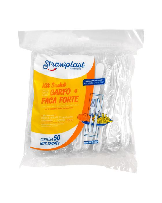 Características:Chegou o Kit Sachê Garfo e Faca Forte Strawplast. A embalagem em Sachê garante mais facilidade e higiene na hora de servir clientes e convidados, sendo ideal para praças de alimentação, festas e eventos. Substitua os talheres de metal com a elegância e praticidade dos descartáveis. O Garfo e Faca da linha Forte possuem estrutura reforçada, indicado para refeições completas.- Ideal para praças de alimentação, lanchonetes, restaurantes e eventos- Material: PS (poliestireno)- Pacote com 50 sachês- Dimensões (diâmetro x altura): - Sachê: 3,8 x 22cm - Garfo: 2,65 x 17,9cm - Faca: 2,14 x 18,6cm- Cor: Branco * As especificações podem ser alteradas sem aviso prévio** Imagem meramente ilustrativa.