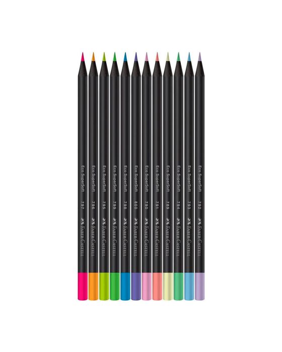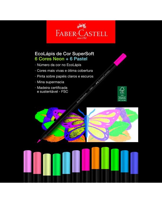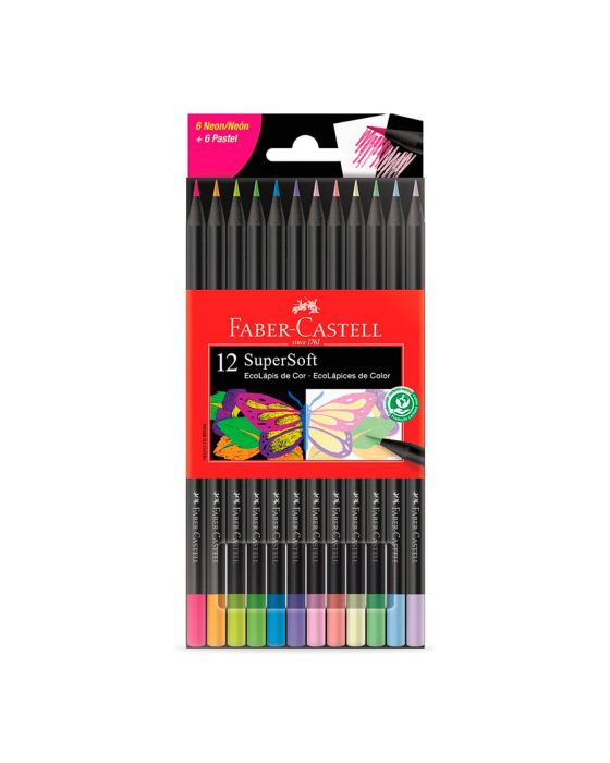 Características: Com o Lápis SuperSoft Faber-Castell você terá a melhor qualidade e um lindo resultado em seus trabalhos! São 12 EcoLápis de Cor, sendo 6 cores Neon, para iluminar seus desenhos, e 6 cores Pastel, dando um toque mais doce e delicado. Mina supermacia exclusiva, garantindo o máximo de conforto ao pintar. Eles possuem cores mais vivas e com ótima cobertura, sobre papéis claros e escuros. Número da Cor no EcoLápis. Produzido com madeira 100% reflorestada e certificada pelo FSC: respeito ao meio ambiente.- 6 cores Neon + 6 cores Pastel- Número da cor no EcoLápis- Cores mais vivas e ótima cobertura- Pinta sobre papéis claros e escuros- Mina supermacia- Madeira certificada e sustentável - FSC* As especificações podem ser alteradas sem aviso prévio ** Imagem meramente ilustrativa