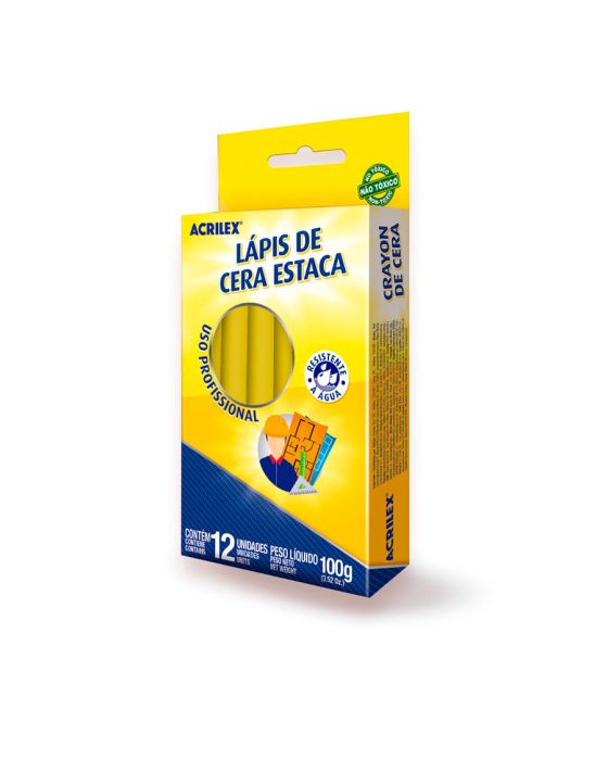 Caracteristicas:- Marca: Acrilex.- Modelo: 09110.- Linha: Lápis de Cera Estaca.- Cor: Amarela.- Contém: 1 caixa com 12 unidades do produto.- Fabricado com ceras de alta qualidade - Proporciona cobertura e traços de grandes áreas sem esforço - Não tóxico - Não mancha as mãos.- Uso Macio.- Uso Profissional.- Traço Macio.Onde usar:- Ideal para para marcar a madeira, couro, borracha, cimento, mármore e granito, etc. Composição:- Ceras, Cargas Minerais Inertes e Pigmentos.Conservação:- Evite a exposição direta aos raios solares e temperaturas acima de 45°C, pois o produto pode sofrer alterações.- Armazenar em local seco e ventilado.- Frágil, evite quedas e choques.* As especificações podem ser alteradas sem aviso prévio ** Imagem meramente ilustrativa.