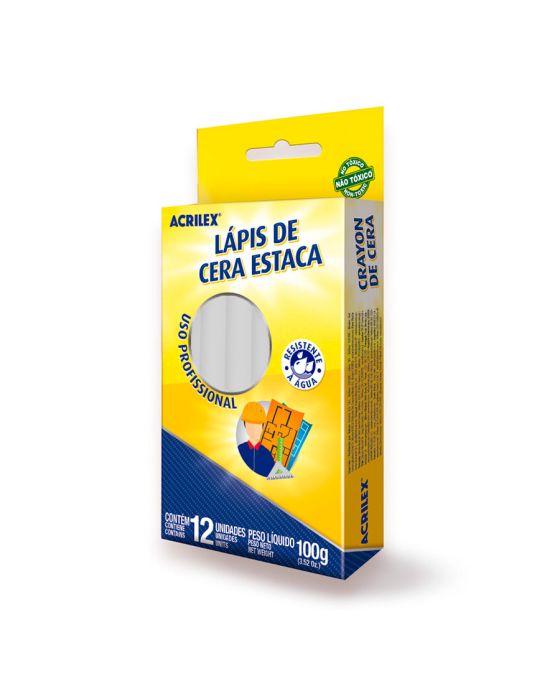 Caracteristicas:- Marca: Acrilex.- Modelo: 09110.- Linha: Lápis de Cera Estaca.- Cor: Branco.- Contém: 1 caixa com 12 unidades do produto.- Fabricado com ceras de alta qualidade - Proporciona cobertura e traços de grandes áreas sem esforço - Não tóxico - Não mancha as mãos.- Uso Macio.- Uso Profissional.- Traço Macio.Onde usar:- Ideal para para marcar a madeira, couro, borracha, cimento, mármore e granito, etc. * As especificações podem ser alteradas sem aviso prévio ** Imagem meramente ilustrativa.