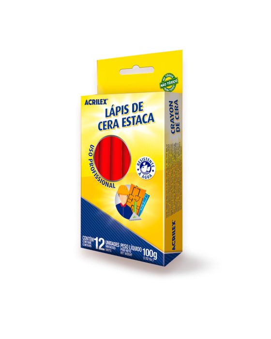 Caracteristicas:- Marca: Acrilex.- Modelo: 09110.- Linha: Lápis de Cera Estaca.- Cor: Vermelho.- Contém: 1 caixa com 12 unidades do produto.- Fabricado com ceras de alta qualidade - Proporciona cobertura e traços de grandes áreas sem esforço - Não tóxico - Não mancha as mãos.- Uso Macio.- Uso Profissional.- Traço Macio.Onde usar:- Ideal para para marcar a madeira, couro, borracha, cimento, mármore e granito, etc. Composição:- Ceras, Cargas Minerais Inertes e Pigmentos.Conservação:- Evite a exposição direta aos raios solares e temperaturas acima de 45°C, pois o produto pode sofrer alterações.- Armazenar em local seco e ventilado.- Frágil, evite quedas e choques.* As especificações podem ser alteradas sem aviso prévio ** Imagem meramente ilustrativa.
