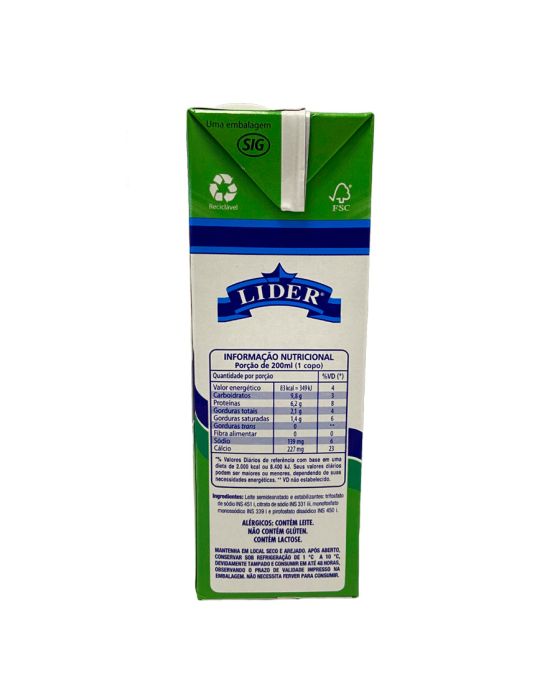Caracteristicas:O leite UHT Lider Semi Desnatado 1L é ideal para o dia a dia, pois foi desenvolvido com a máxima qualidade para agradar toda a família. Sua fórmula única possui baixo teor de gordura, além de ser uma ótima fonte de cálcio. Perfeito para saborear uma deliciosa bebida em qualquer momento do dia ou para utilizar no preparo de vários tipos de receitas!Detalhes:- Marca: Lider.- Modelo: Semi Desnatado.- Linha: Leite UHT.- Volume: 1 litro.- Teor de gordura: 1%.- Com tampa.- Fácil de abrir.- Fácil de servir.- Embalagem reciclável.Ingredientes: - Leite semidesnatado e estabilizantes: trifosfato de sódio INS 451 i, Citrato de sódio INS 331 iii, Monofosfato monossódico INS 339 i e pirofosfato dissódico INS 450 i.Conservação: - Mantenha em local seco e arejado. Após aberto conservar sob refrigeração de 1ºC a 10ºC, devidamente tampado e consumir em até 48 horas, observando o prazo de validade impresso na embalagem.- Não necessita ferver para consumir.* ALÉRGICOS: CONTÉM LEITE. CONTÉM LACTOSE.** NÃO CONTÉM GLÚTEN.AVISO: Este produto não deve ser usado para alimentar crianças menores de 1(um) ano de idade, a não ser por indicação expressa de médico ou nutricionista. O aleitamento materno evita infeccções e alergias e deve ser mantido até a criança completar 2(dois) anos de idade ou mais.* As especificações podem ser alteradas sem aviso prévio ** Imagem meramente ilustrativa.