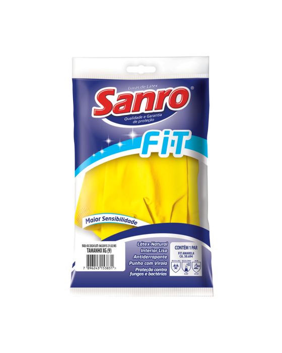 Características:As Luvas Látex Fit Sanro, são ideais para a limpeza pesada do dia a dia, e manuseio de produtos químicos garantindo maior segurança na execução de tarefas sem causar danos a integridade física das pessoas! Possui seu interior liso e palma antiderrapante, para facilitar o manuseio de objetos.Detalhes:- Marca: Sanro;- Modelo: Fit;- Referência: 284990402;- Linha: Luvas;- Cor: Amarela;- Tamanho: XG;- Registro CA: 50.694;- Contém: 1 embalagem com 1 par de luvas;- Formato Anatômico;- Látex natural;- Interior Liso e exterior antiderrapante;- Punho com virola;- Proteção contra fungos e bactérias.Indústria Brasileira | Validade: 3 anos*.Ideal para: - Indicada para utilização em tarefas que necessitem de proteção mecânica, química e/ou biológica nos seguintes segmentos: conservação e limpeza, uso doméstico, construção civil, jardinagem, serviços gerais, agroindústria e pesca, manuseio de produtos químicos e serviços de pintura.Instruções de uso:- Verifique o tamanho correto das suas mãos e da luva, afim de evitar acidentes e fadiga excessiva;- Antes do uso, inspecione as luvas quanto a defeitos ou imperfeições;- Recomenda-se retirar anéis, pulseiras e/ou adornos, para evitar danos à luva;- Calce as luvas com as mãos limpas e secas.Conservação:- Manter este produto protegido do calor, umidade e da luz;- Após usar as luvas, lave bem suas superfícies externa e interna, utilizando água e sabão neutro;- Deixe-as secando do avesso, penduradas com o punho para baixo, na sombra e longe do calor;- Substituir a luva imediatamente quando observados rasgos, furos, ou qualquer outro dano que comprometam as características do produto.Medidas:- Dimensões da embalagem: 27,8 x 16 x 0,5cm (CxLxA);- Comprimento luva: 29cm;- Espessura luva: 0,23mm.Atenção! As luvas não são indicadas para uso ou exposição prolongada a solventes, óleos ou graxas.ALÉRGICOS: CONTÉM LÁTEX DE BORRACHA NATURAL. * 3 anos da data de fabricação, enquanto a embalagem não for aberta, ou exposta a fontes de luz e calor.* As especificações podem ser alteradas sem aviso prévio ** Imagem meramente ilustrativa.