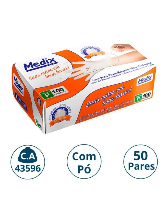 Características:A Luva Látex com Pó Medix é feita em látex 100% natural, sendo lisa, ambidestra, não esterilizada e de cor natural, contém pó de amido de milho grau U.S.P que é bioabsorvível e que facilita o processo de colocação e retirada da luva. Por proporcionar uma barreira contra contaminação, é indicada para procedimentos não cirúrgicos, evitando o contato com sangue, fluidos orgânicos, membranas mucosas, artigos sujos ou em outros procedimentos não invasivos.Detalhes:- Marca: Medix;- Referência: 29;- Linha: Luvas;- Tipo: Látex;- Cor: Branca;- Tamanho: P;- C.A: 43596;- Quantidade de luvas: 100 unidades;- Quantidade de pares: 50 pares;- Contém: 1 embalagem com 100 unidades;- Para: procedimento não cirúrgico;- Possui punho com acabamento enrolado;- Descartável e de uso único;- Não estéril;- Com pó;- Ambidestra;- Proteção contra agentes biológicos.Fabricado na Tailândia. | Validade: 5 anos após a data de fabricação.Ideal para:- Hospitais, Clínica médica, Hospitais e clínica veterinários, Laboratórios, Estúdio de tatuagem e em qualquer ambiente que seja necessário proteção contra riscos biológicos.Modo de uso:- Verifique o tamanho adequado para suas mãos conforme indicação;- Verifique a integridade da embalagem;- Realize a higiene das mãos, assegure que as mãos estejam limpas e secas para o passo seguinte;- Retire a luva da embalagem o mais próximo possível do momento do uso;- Calce a luva cuidadosamente, sem anéis, pulseiras, relógios ou outros acessórios que possam perfurar o produto;- Após o uso, retire a luva e descarte-a imediatamente em local adequado;- Realize a higiene das mãos.Orientações:- Não reutilizar ou esterilizar após o uso;- Proibido reprocessar.Composição:- Produto confeccionado em látex de borracha 100% natural.Medidas:- Dimensões: 20 x 11,1 x 6,5cm (CxLxA);- Peso: 467g. ATENÇÃO: PROIBIDO REPROCESSAR, DESTRUIR APÓS O USO!ALÉRGICOS: ESTE PRODUTO CONTÉM LÁTEX, SEU USO PODE CAUSAR REAÇÕES ALÉRGICAS EM PESSOAS SENSÍVEIS À LÁTEX.Em caso de reações alérgicas, procure um médico.* As especificações podem ser alteradas sem aviso prévio ** Imagem meramente ilustrativa.