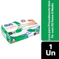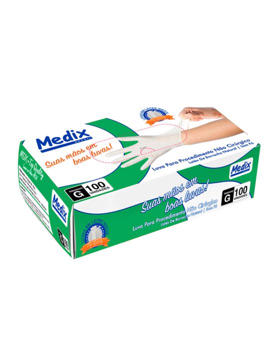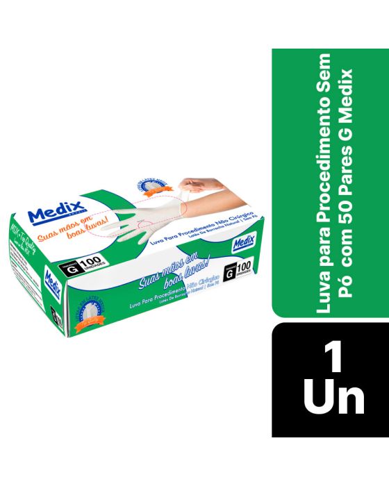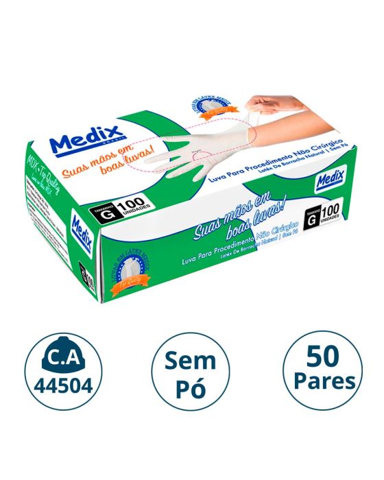 Características:A Luva Sem Pó Medix é feita em látex 100% natural, sendo lisa, ambidestra, não esterilizada e de cor natural, por proporcionar uma barreira contra contaminação, é indicada para procedimentos não cirúrgicos, evitando o contato com sangue, fluidos orgânicos, membranas mucosas, artigos sujos ou em outros procedimentos não invasivos.Detalhes:- Marca: Medix;- Referência: 6095;- Linha: Luvas;- Tipo: Látex;- Cor: Branca;- Tamanho: G;- C.A: 44504;- Quantidade de luvas: 100 unidades;- Quantidade de pares: 50 pares;- Contém: 1 caixa com 100 unidades;- Para: procedimento não cirúrgico;- Possui punho com acabamento enrolado;- Descartável e de uso único;- Não estéril;- Sem pó;- Ambidestra;- Proteção contra agentes biológicos.Fabricado na Tailândia. | Validade: 5 anos após a data de fabricação.Ideal para:- Hospitais, Clínica médica, Hospitais e clínica veterinários, Laboratórios, Estúdio de tatuagem e em qualquer ambiente que seja necessário proteção contra riscos biológicos.Modo de uso:- Verifique o tamanho adequado para suas mãos conforme indicação;- Verifique a integridade da embalagem;- Realize a higiene das mãos, assegure que as mãos estejam limpas e secas para o passo seguinte;- Retire a luva da embalagem o mais próximo possível do momento do uso;- Calce a luva cuidadosamente, sem anéis, pulseiras, relógios ou outros acessórios que possam perfurar o produto;- Após o uso, retire a luva e descarte-a imediatamente em local adequado;- Realize a higiene das mãos.Orientações:- Não reutilizar ou esterilizar após o uso;- Proibido reprocessar.Composição:- Produto confeccionado em látex de borracha 100% natural.Medidas:- Dimensões: 20 x 11,1 x 6,5cm (CxLxA);- Peso: 467g.ATENÇÃO: PROIBIDO REPROCESSAR, DESTRUIR APÓS O USO!ALÉRGICOS: ESTE PRODUTO CONTÉM LÁTEX, SEU USO PODE CAUSAR REAÇÕES ALÉRGICAS EM PESSOAS SENSÍVEIS À LÁTEX.Em caso de reações alérgicas, procure um médico.* As especificações podem ser alteradas sem aviso prévio ** Imagem meramente ilustrativa.