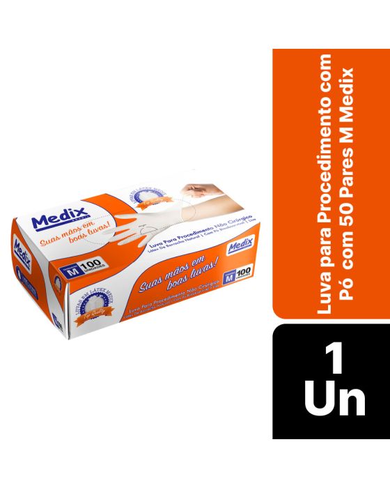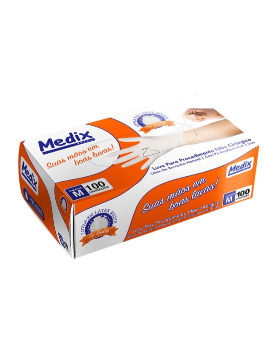 Características:A Luva Látex com Pó Medix é feita em látex 100% natural, sendo lisa, ambidestra, não esterilizada e de cor natural, contém pó de amido de milho grau U.S.P que é bioabsorvível e que facilita o processo de colocação e retirada da luva. Por proporcionar uma barreira contra contaminação, é indicada para procedimentos não cirúrgicos, evitando o contato com sangue, fluidos orgânicos, membranas mucosas, artigos sujos ou em outros procedimentos não invasivos.Detalhes:- Marca: Medix;- Referência: 30;- Linha: Luvas;- Cor: Branca;- Tipo: Látex;- Tamanho: M;- C.A: 44396;- Quantidade de luvas: 100 unidades;- Quantidade de pares: 50 pares;- Contém: 1 embalagem com 100 unidades;- Para: procedimento não cirúrgico;- Possui punho com acabamento enrolado;- Descartável e de uso único;- Não estéril;- Com pó;- Ambidestra;- Proteção contra agentes biológicos.Fabricado na Tailândia. | Validade: 5 anos após a data de fabricação.Ideal para:- Hospitais, Clínica médica, Hospitais e clínica veterinários, Laboratórios, Estúdio de tatuagem e em qualquer ambiente que seja necessário proteção contra riscos biológicos.Modo de uso:- Verifique o tamanho adequado para suas mãos conforme indicação;- Verifique a integridade da embalagem;- Realize a higiene das mãos, assegure que as mãos estejam limpas e secas para o passo seguinte;- Retire a luva da embalagem o mais próximo possível do momento do uso;- Calce a luva cuidadosamente, sem anéis, pulseiras, relógios ou outros acessórios que possam perfurar o produto;- Após o uso, retire a luva e descarte-a imediatamente em local adequado;- Realize a higiene das mãos.Orientações:- Não reutilizar ou esterilizar após o uso;- Proibido reprocessar.Composição:- Produto confeccionado em látex de borracha 100% natural.Medidas:- Dimensões: 20 x 11,1 x 6,5cm (CxLxA);- Peso: 467g.ATENÇÃO: PROIBIDO REPROCESSAR, DESTRUIR APÓS O USO!ALÉRGICOS: ESTE PRODUTO CONTÉM LÁTEX, SEU USO PODE CAUSAR REAÇÕES ALÉRGICAS EM PESSOAS SENSÍVEIS À LÁTEX.Em caso de reações alérgicas, procure um médico.* As especificações podem ser alteradas sem aviso prévio ** Imagem meramente ilustrativa.